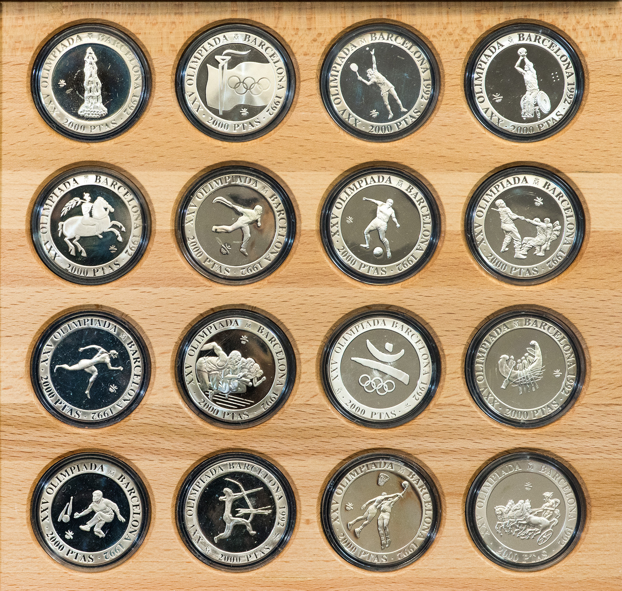 JUAN CARLOS I. Estuche conmemorativo FNMT. Colección 16 pìezas de 2.000 pts. 1990-1992. AR 27 g. Total: 432 g. Proof. En su estuche y con certificados.