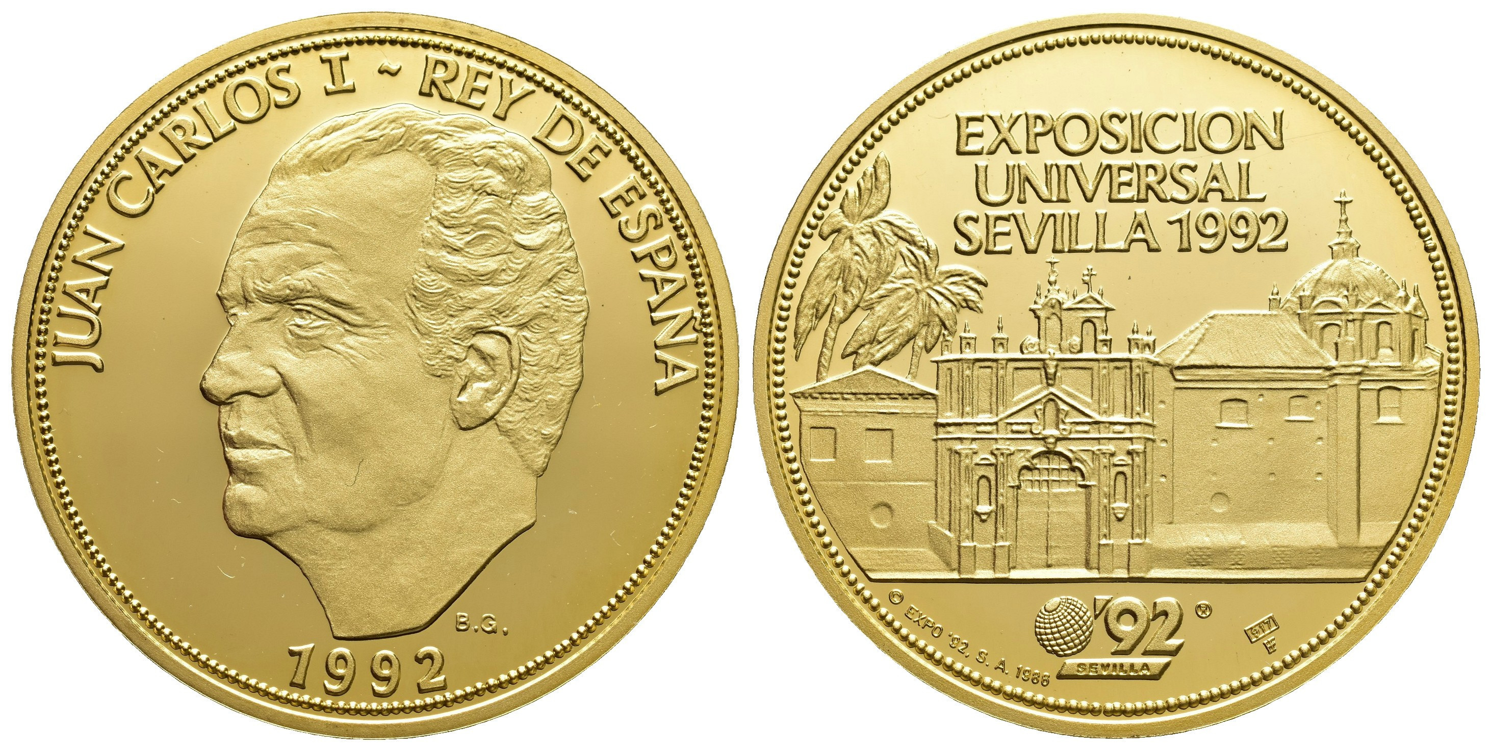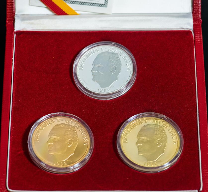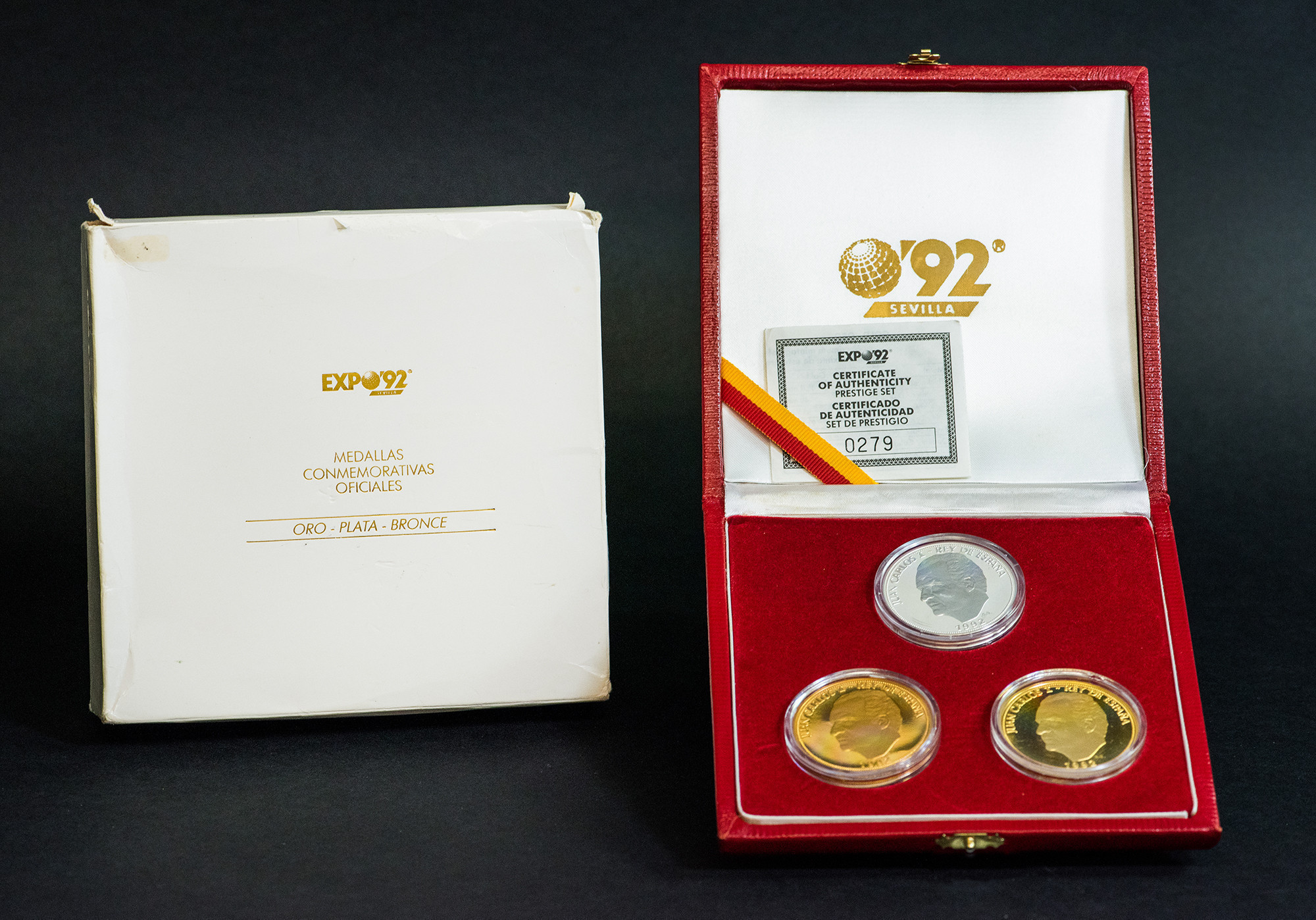 JUAN CARLOS I. Estuche. Medallas conmemorativas oficiales. Expo Sevilla '92. 1986. Oro (33,92 g), plata ((36,42 g) y bronce. Proof y la de bronce Prooflike. En su estuche y con certificado.
