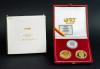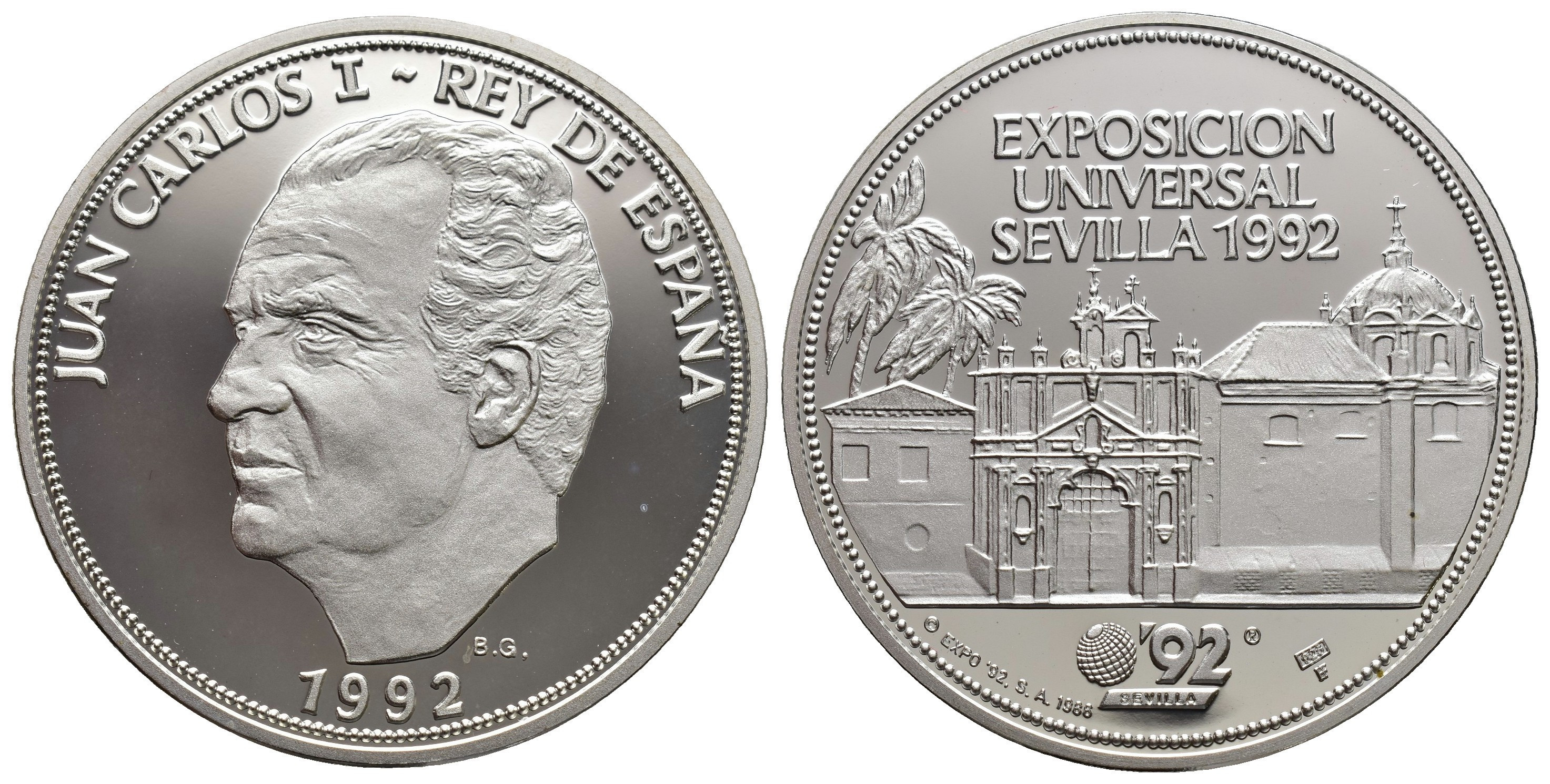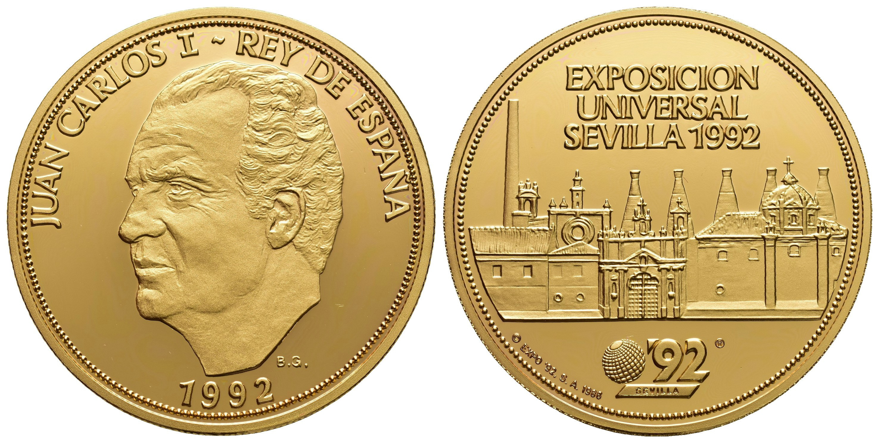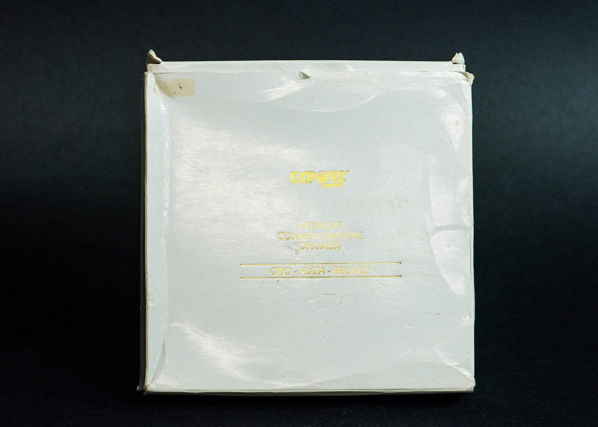 JUAN CARLOS I. Estuche. Medallas conmemorativas oficiales. Expo Sevilla '92. 1986. Oro (33,92 g), plata ((36,42 g) y bronce. Proof y la de bronce Prooflike. En su estuche y con certificado.