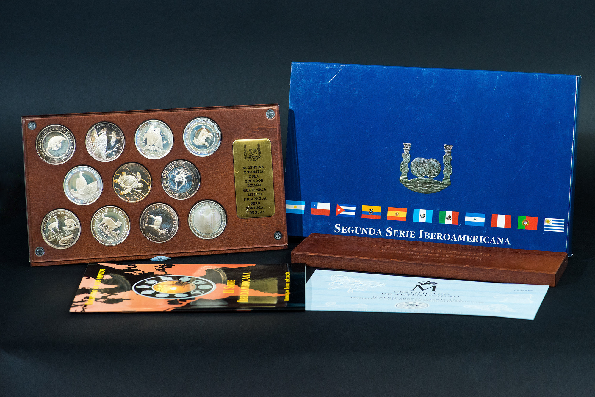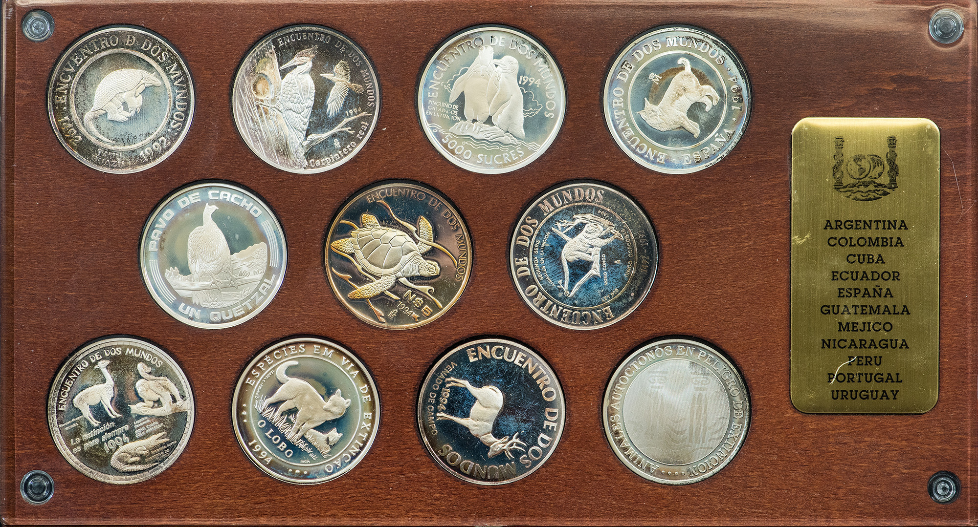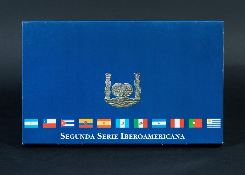 JUAN CARLOS I. Estuche FNMT "II Serie Iberoamericana. Animales autóctonos en peligro de extinción". 10 monedas conmemorativas y una medalla (AR 27 g). Con expositor de madera, en su estuche y con certificado. Proof.