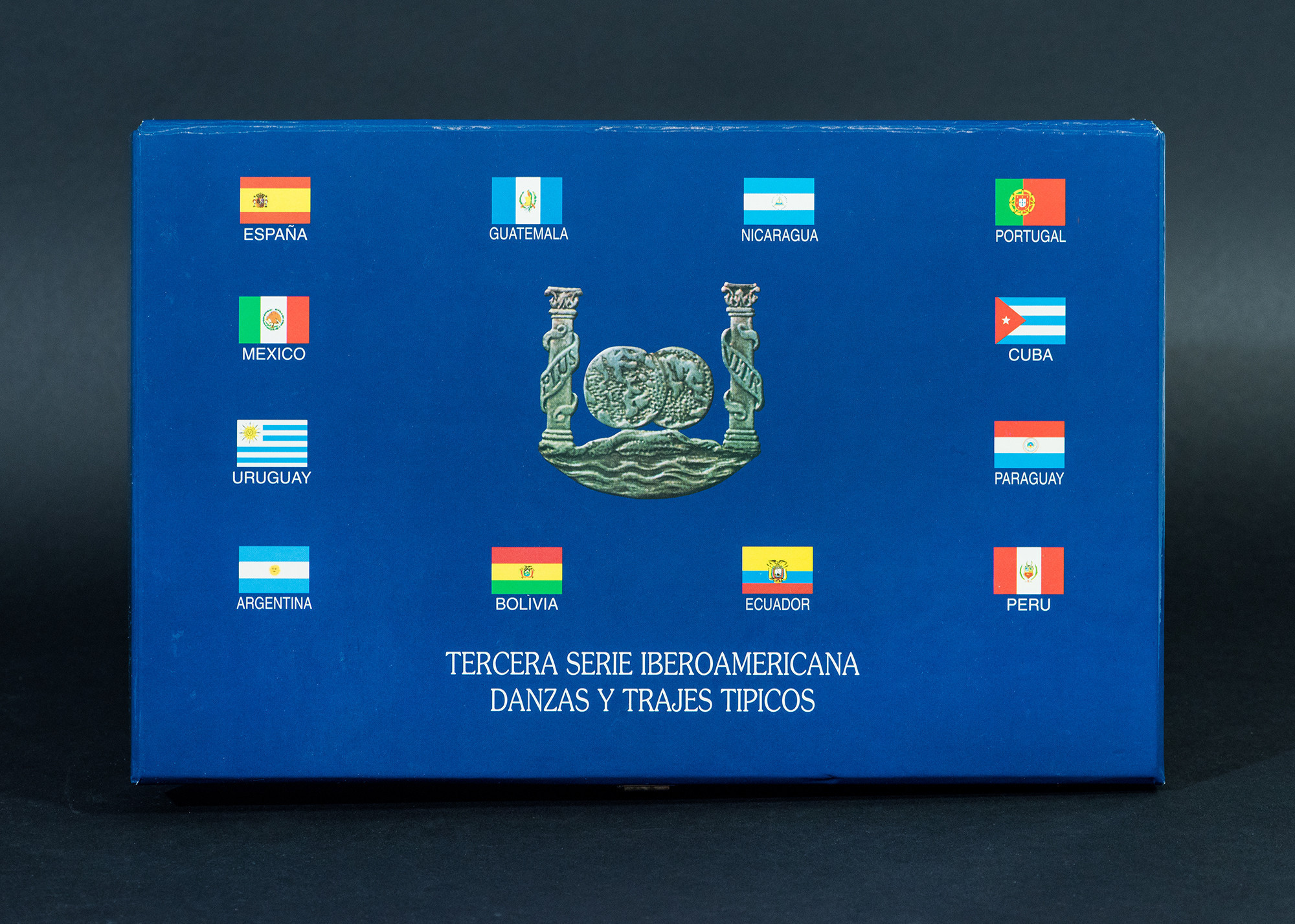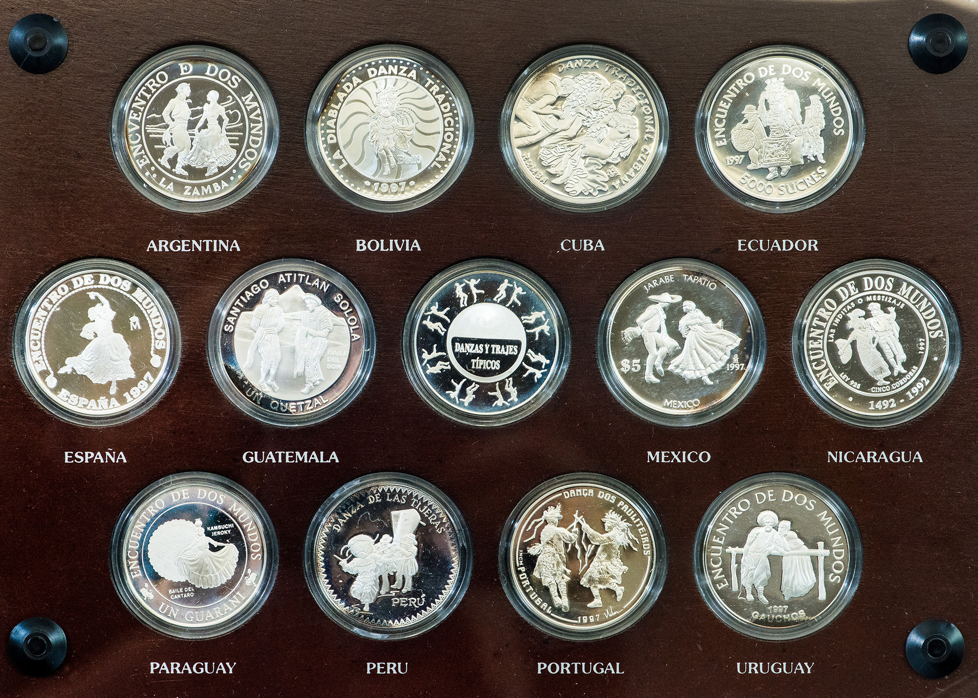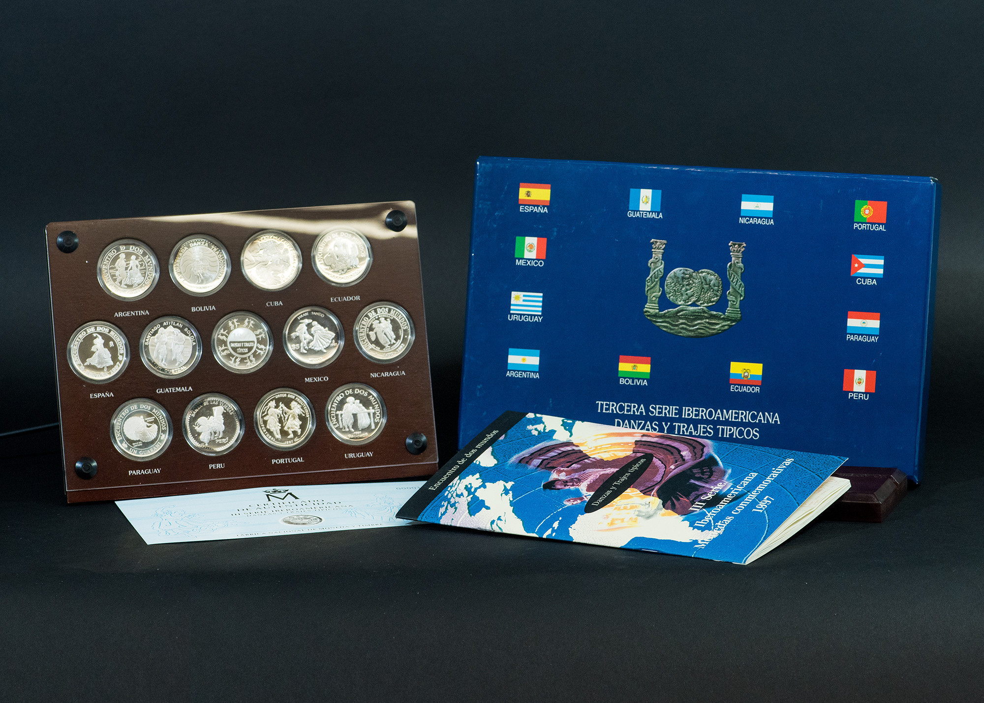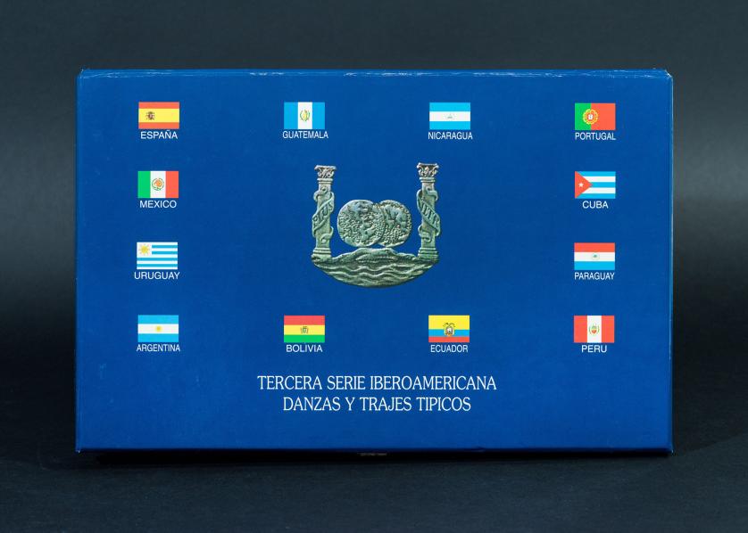 JUAN CARLOS I. III Serie Iberoamericana. Danzas y trajes típicos. 1997. FNMT. Total 13 piezas: 12 monedas de distintos países y 1 medalla. AR 27 g cada una. En su expositor y estuche originales y con certificado de autenticidad. Prueba.