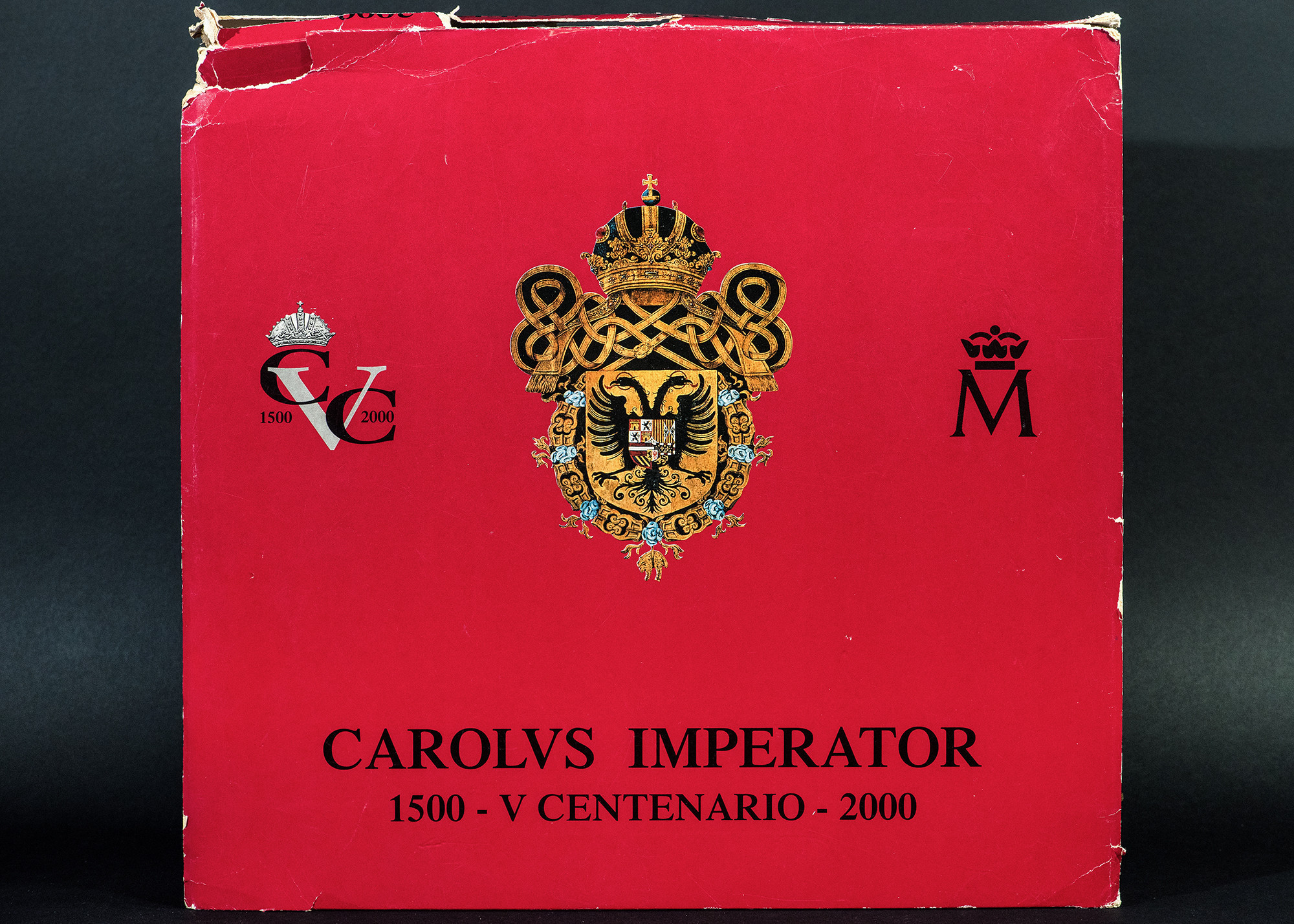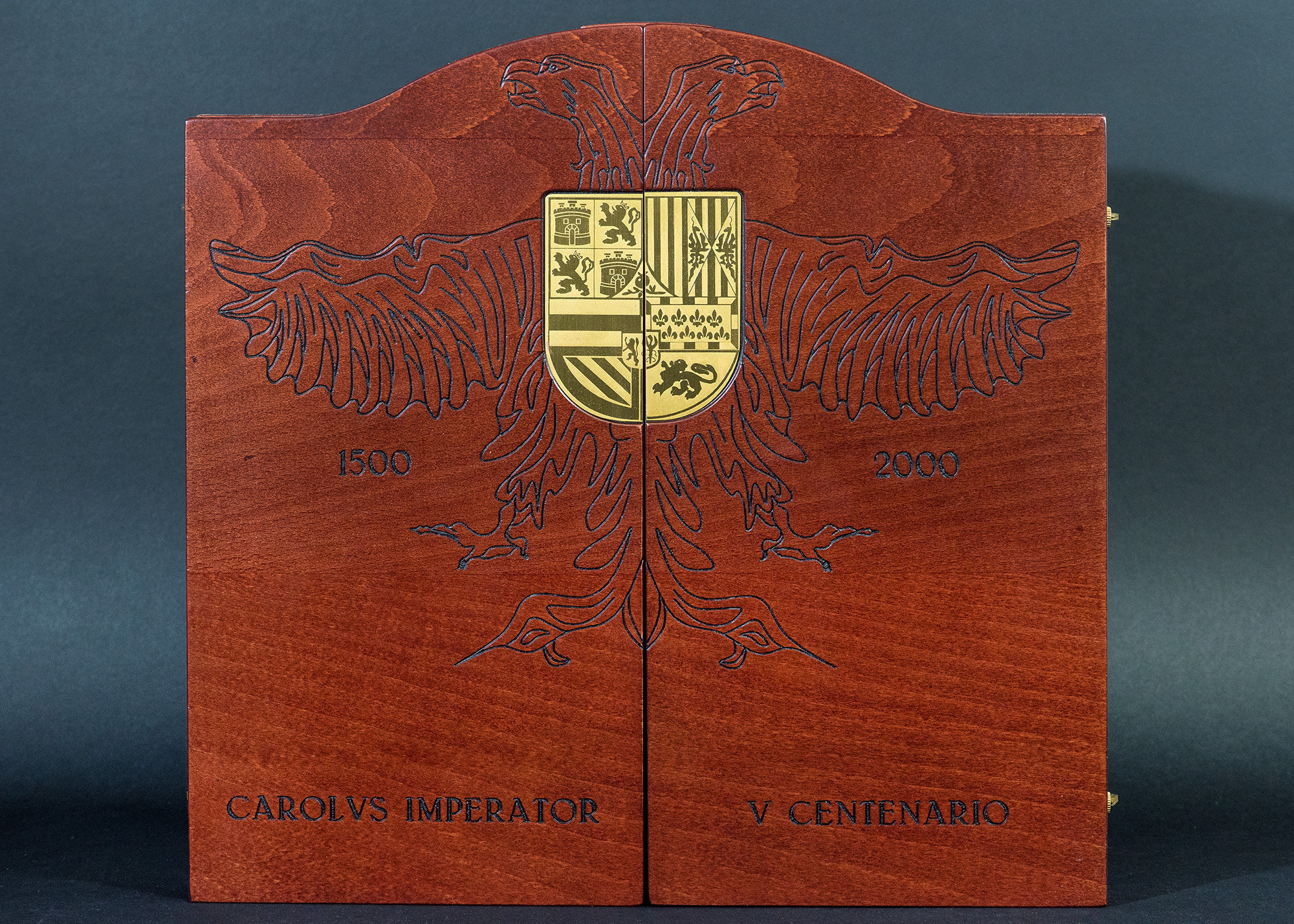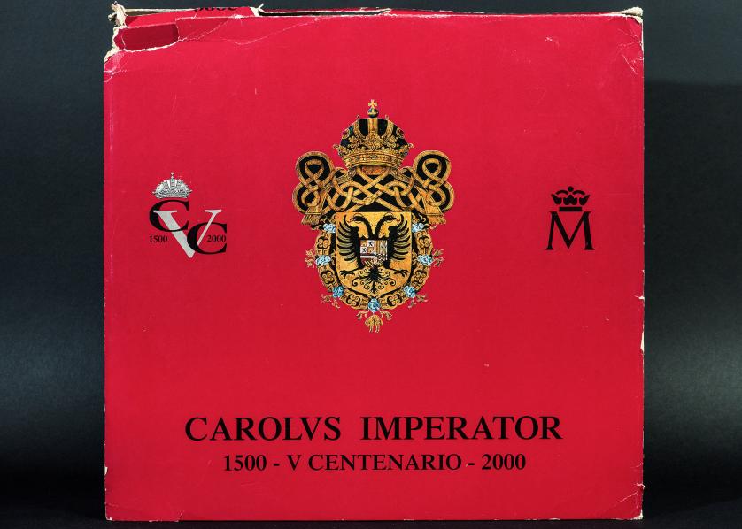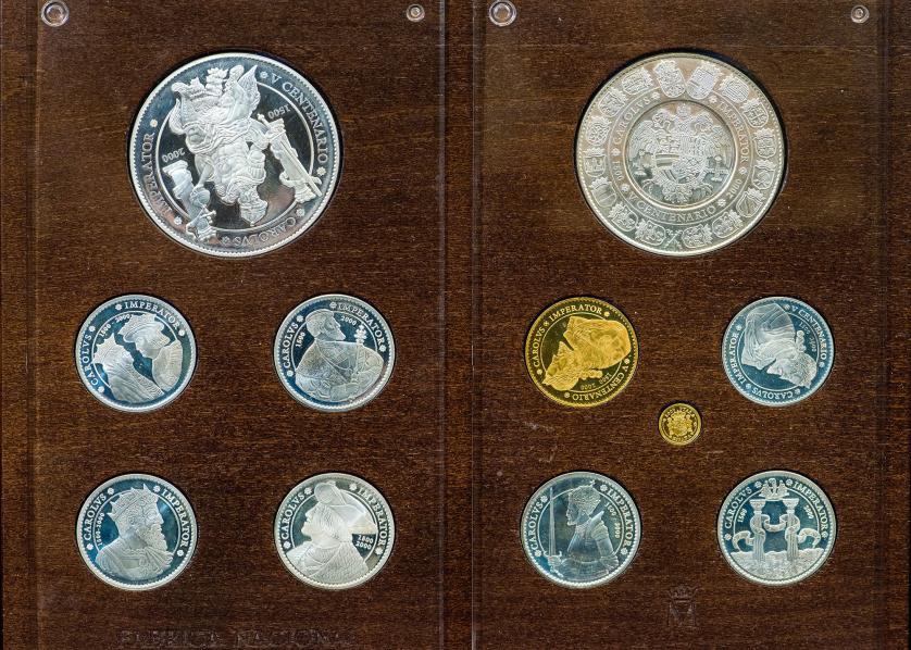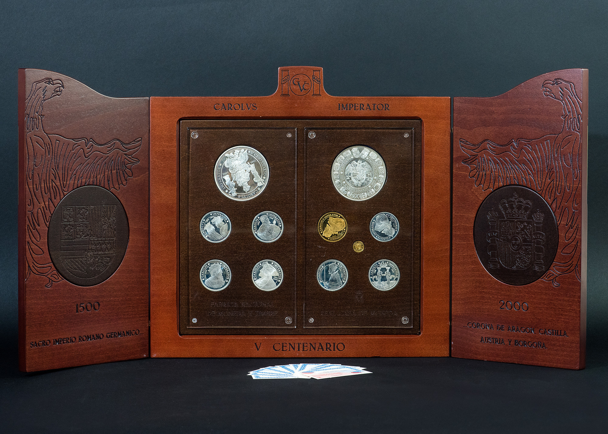 JUAN CARLOS I. Estuche FNMT conmemorativo V Centenario de Carlos V. 11 piezas: 40.000 pts. (AU 15,55 g); 1/2 escudo (AU 1,68 g), 2 cincuentines (AR 168,75 g); 2.000 pts. (6: AR 33,62 g) y 1.000 pts. (AR 13 g). Proof. En estuche expositor de madera y con certificados (falta certificado de uno de los cincuentines).