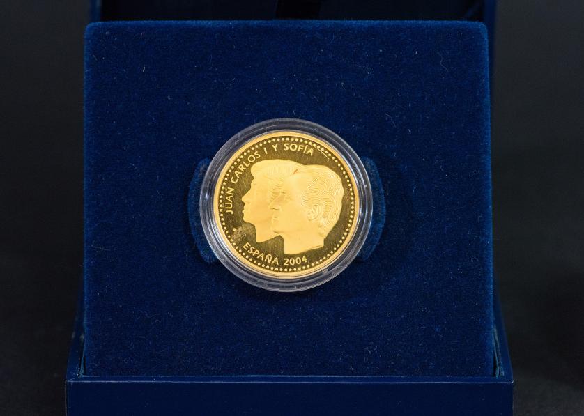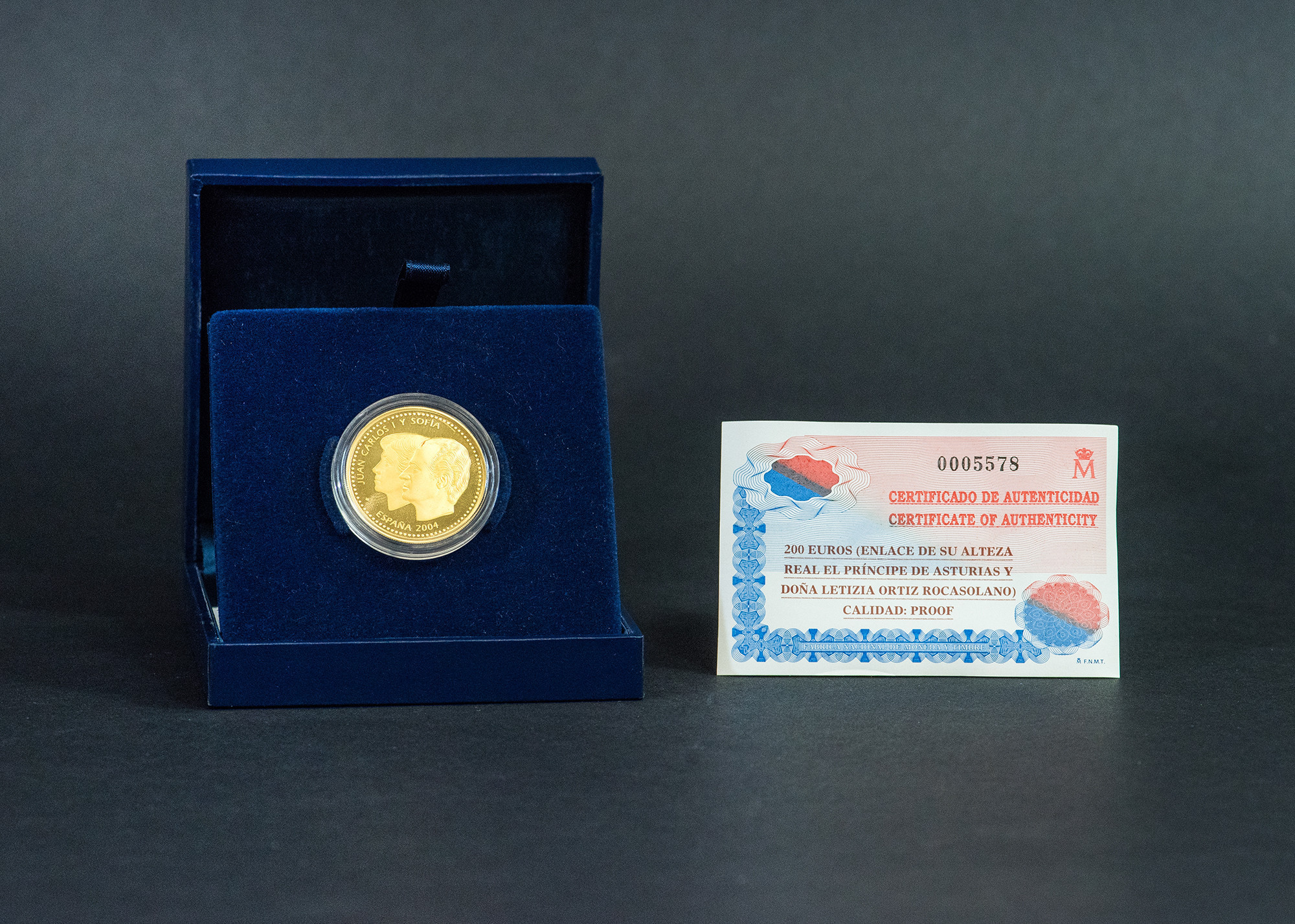 JUAN CARLOS I. Estuche FNMT. Enlace de Felipe y Letizia. 200 euros conmemorativos (AU 13,5 g). 2004. Proof. En su estuche y con certificado.
