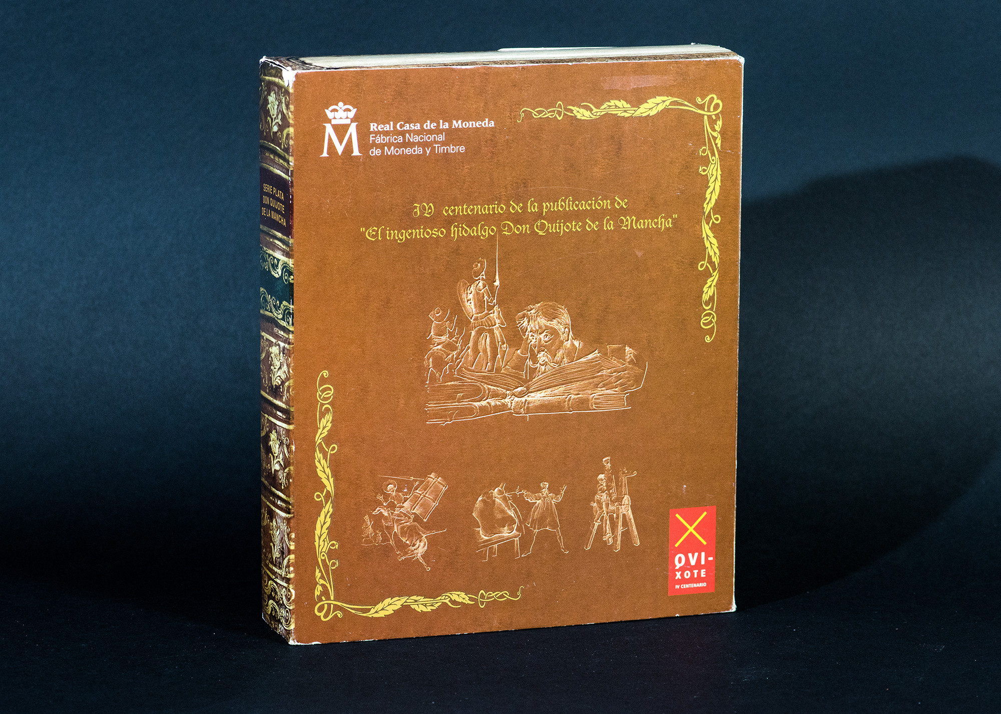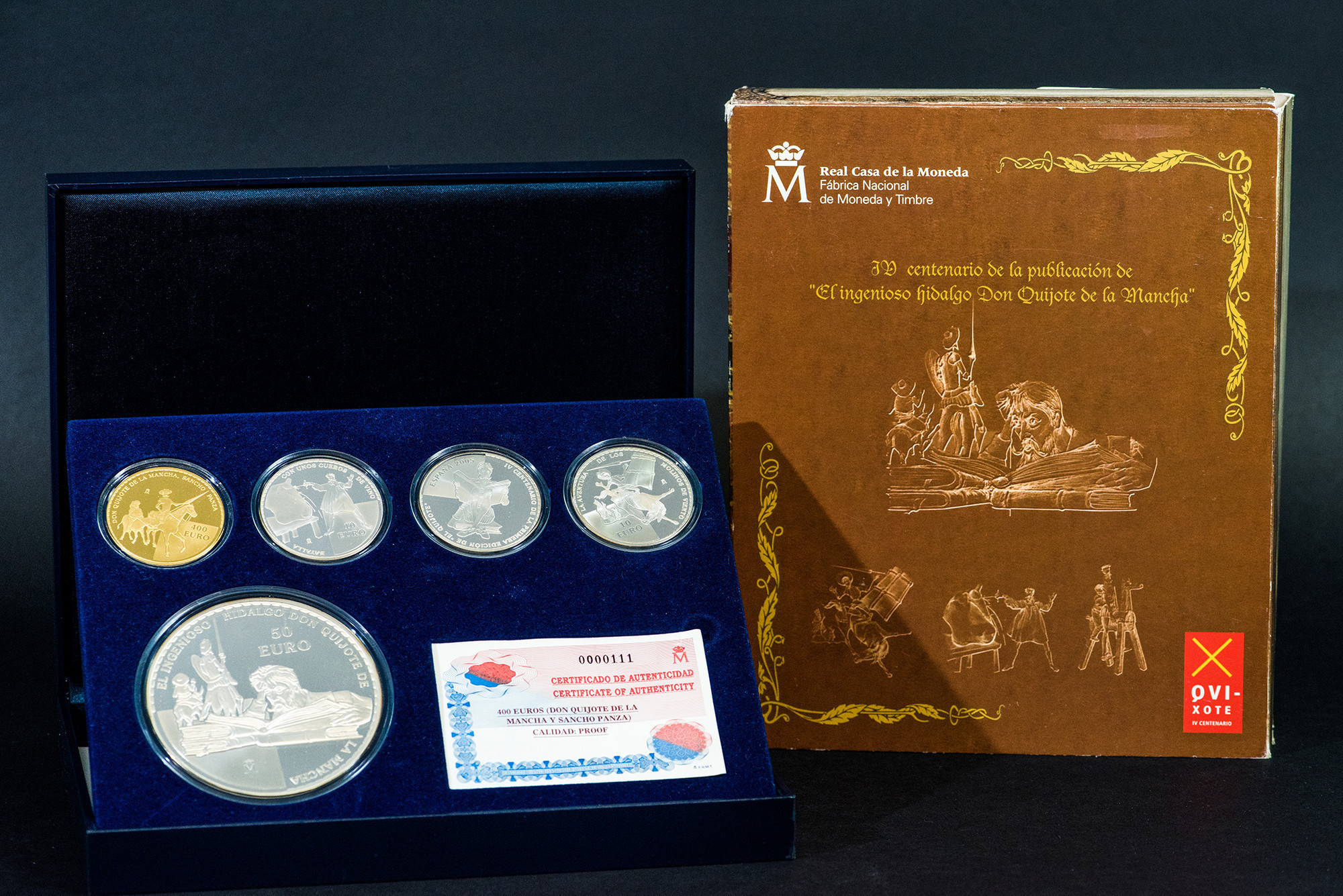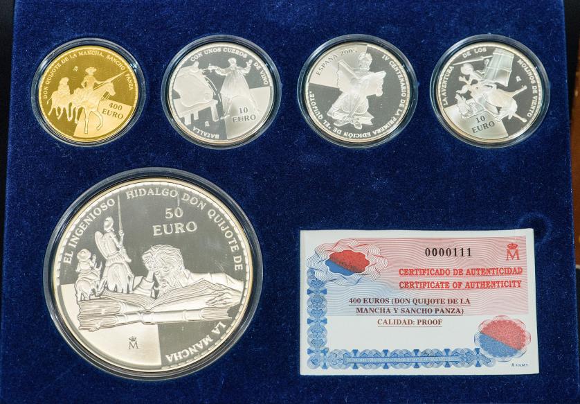 JUAN CARLOS I. Estuche FNMT. IV Centenario de la publicación de "El ingenioso hidalgo Don Quijote de la Mancha". 2005. 400 euros (AU 27 g), cincuentín (AR 168,75 g) y 8 reales (3: AR 27 g). Proof. En su estuche y con certificado.