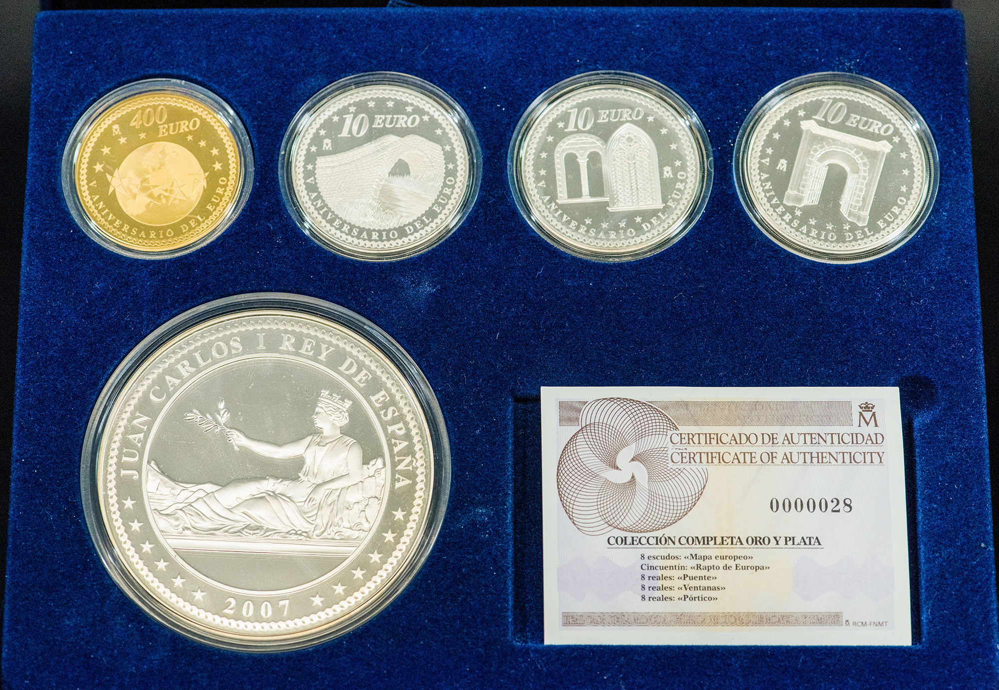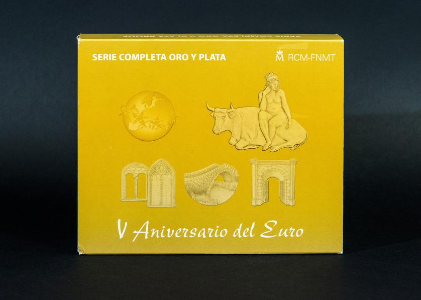 JUAN CARLOS I. Estuche FNMT. V Aniversario del euro. 400 euros (8 escudos, AU 27 g); 50 euros (cincuentín AR 168,75 g) y 10 euros (8 reales, AR 27 g). Proof. En su estuche y con certificado.