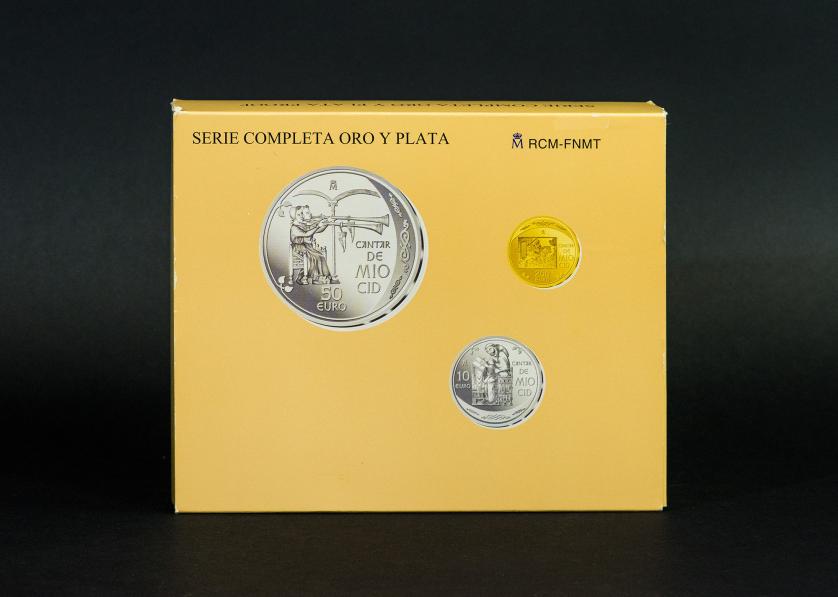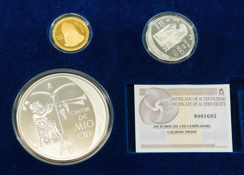 JUAN CARLOS I. Estuche FNMT. Serie conmemorativa del Cantar de Mío Cid. 2007. Oro y plata: 200 euros (AU 13,5 g), 50 euros (AR 168,75 g) y 10 euros (AR 27 g). Proof. En su estuche y con certificado.