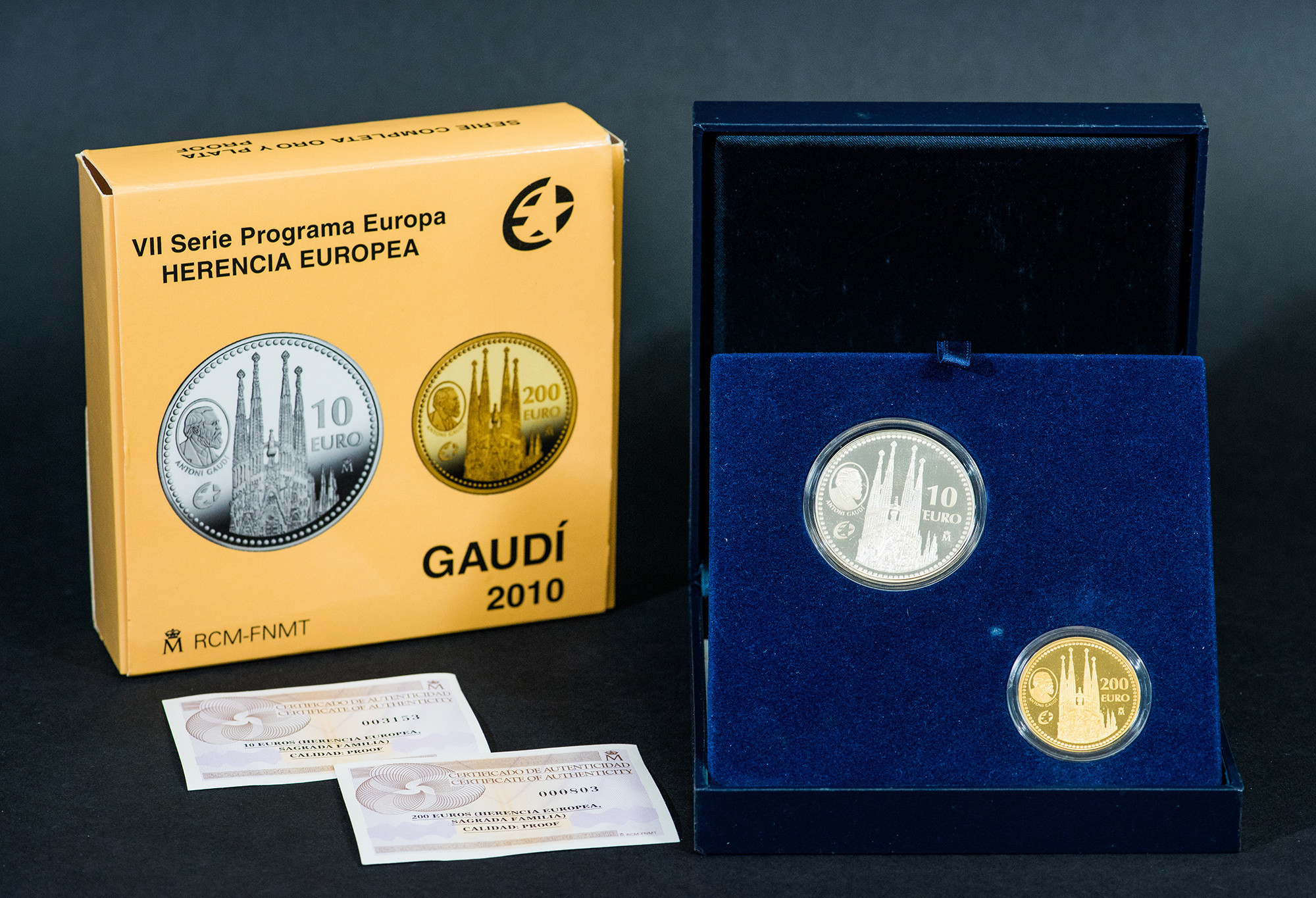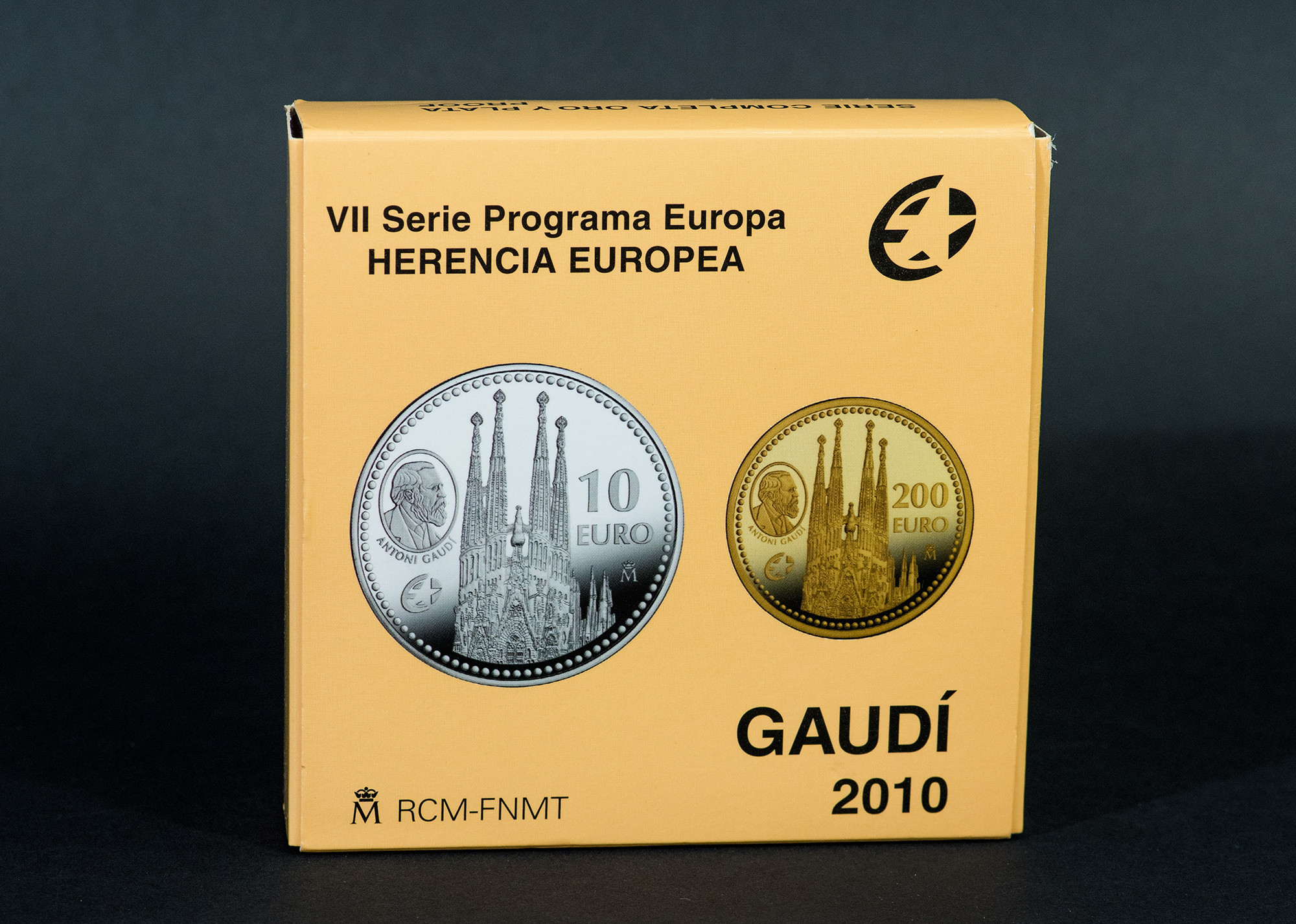 JUAN CARLOS I. Estuche FNMT. VII Serie Programa Europa. Herencia Europea. Gaudí. 2010. 200 euros (AU 13,5 g) y 10 euros (AR 27 g). Proof. En su estuche y con certificado.