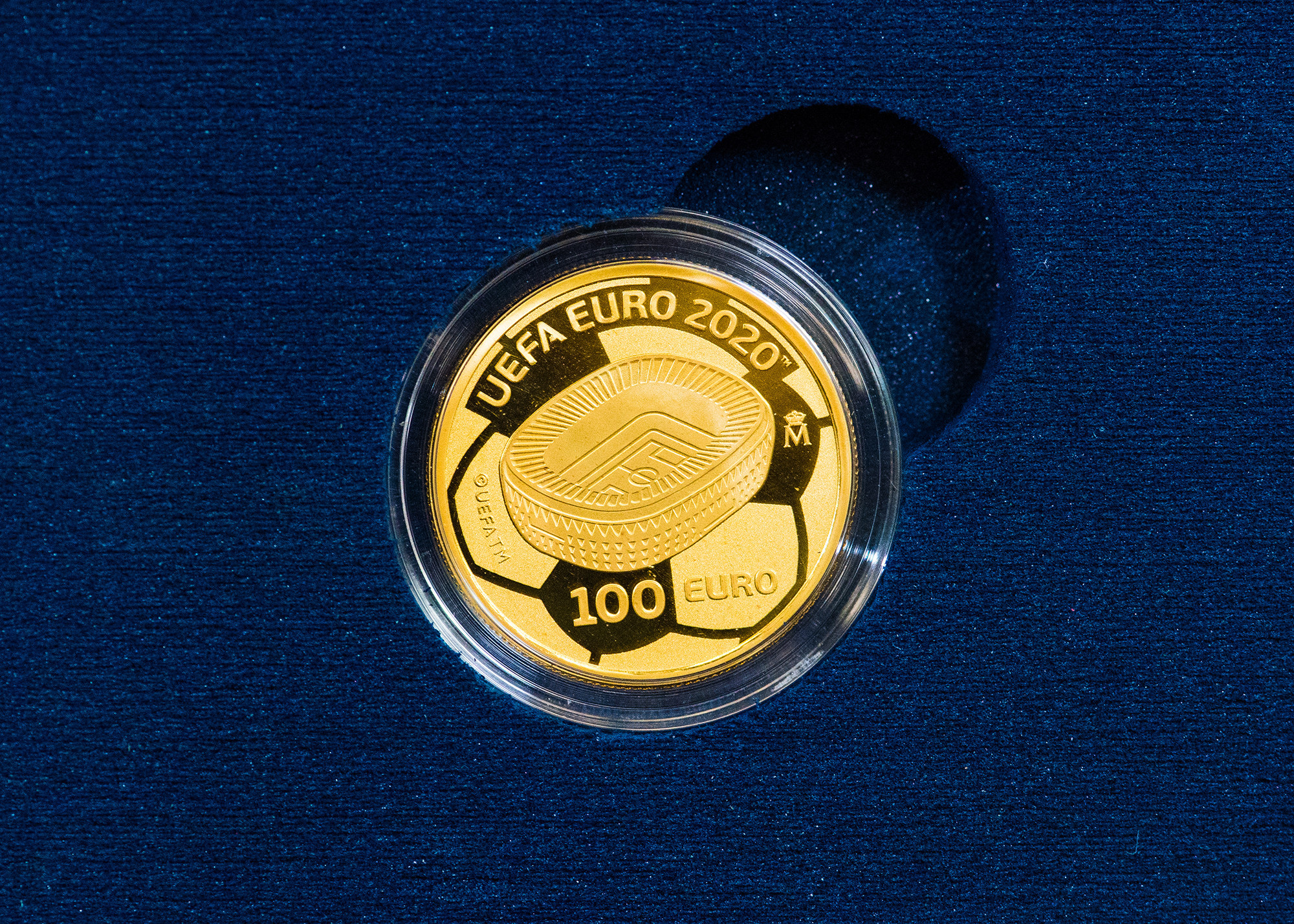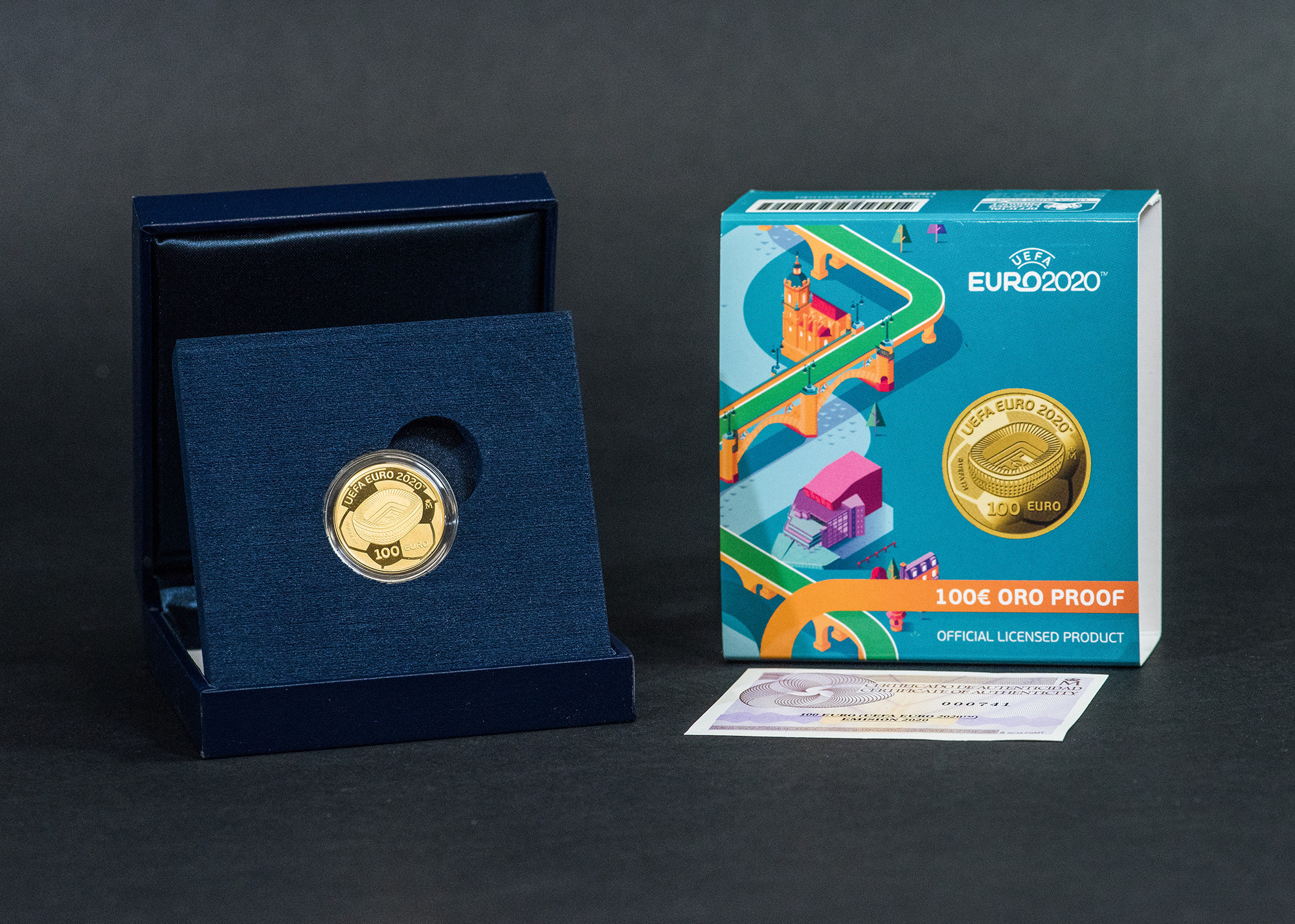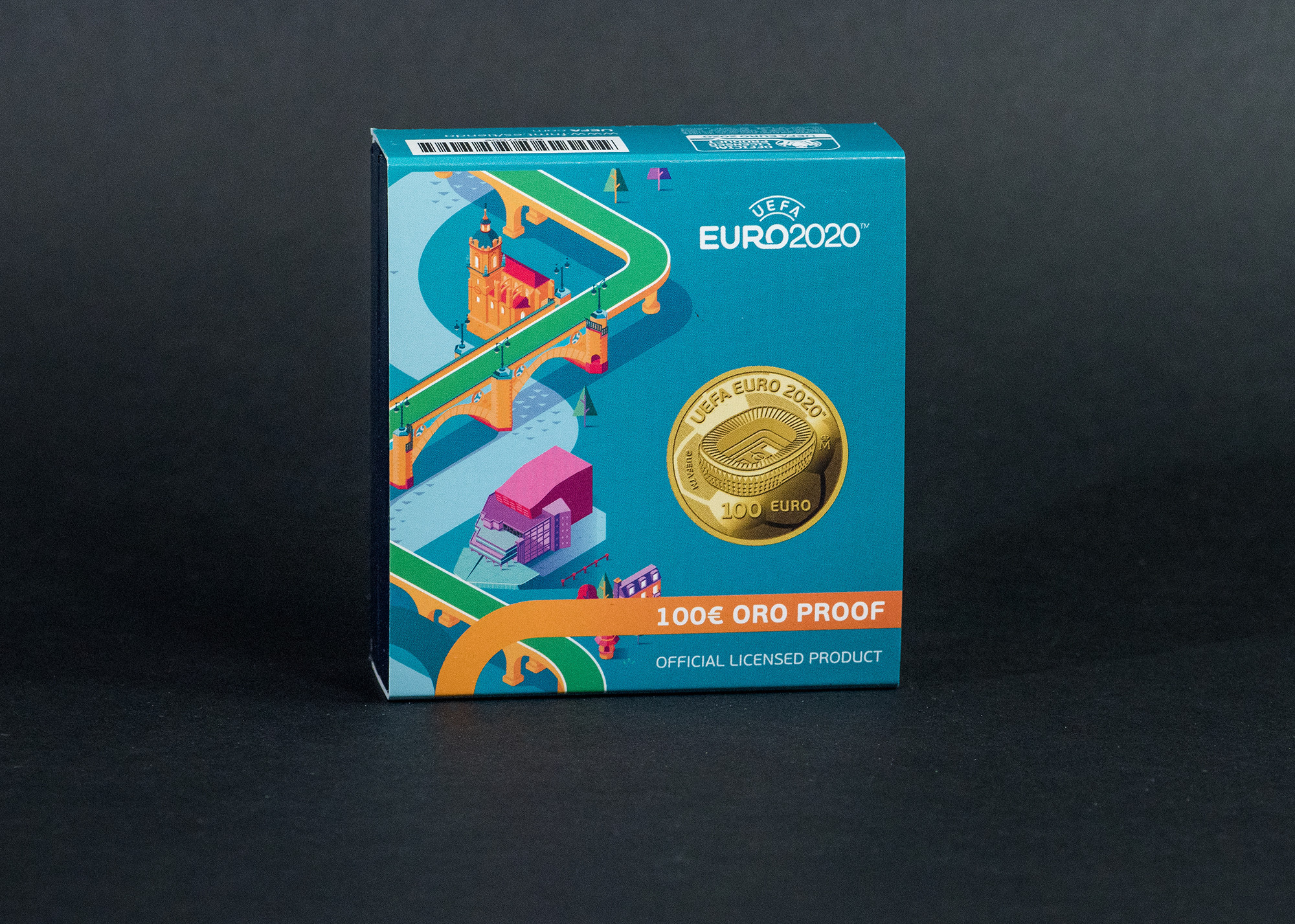 FELIPE VI. UEFA. Euro. 2020. 100 euros conmemorativos (AU 6,75 g). FNMT. Proof. En su estuche y con certificado.