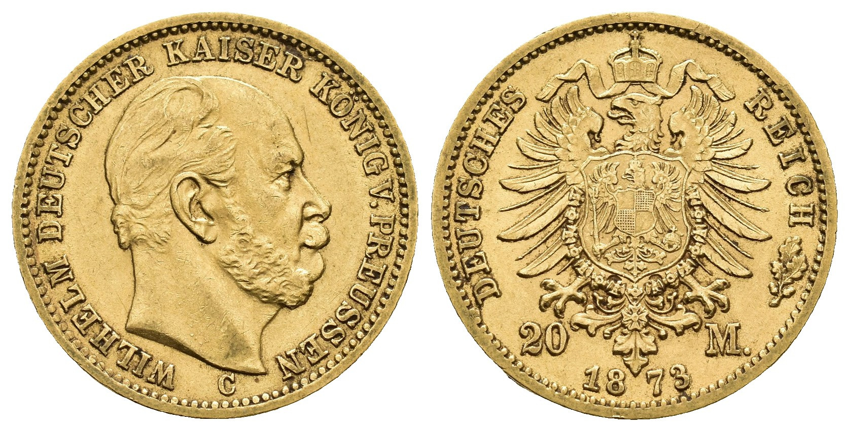 MONEDA EXTRANJERA. ALEMANIA Y ESTADOS ALEMANES. PRUSIA. Guillermo I. 20 marcos. 1873. C. AU 7,96 g. 22,4 mm. KM-501. Rayita en anv. EBC-.