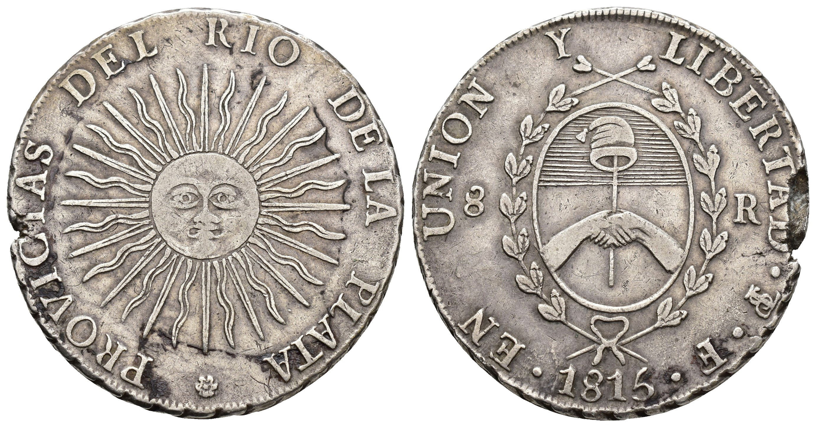 MONEDA EXTRANJERA. ARGENTINA. Río de la Plata. 8 reales. 1815. Error PROVICIAS. AR 26,6 g. 38,8 mm. KM-14. Defecto de cospel. Manchas de óxido. MBC.