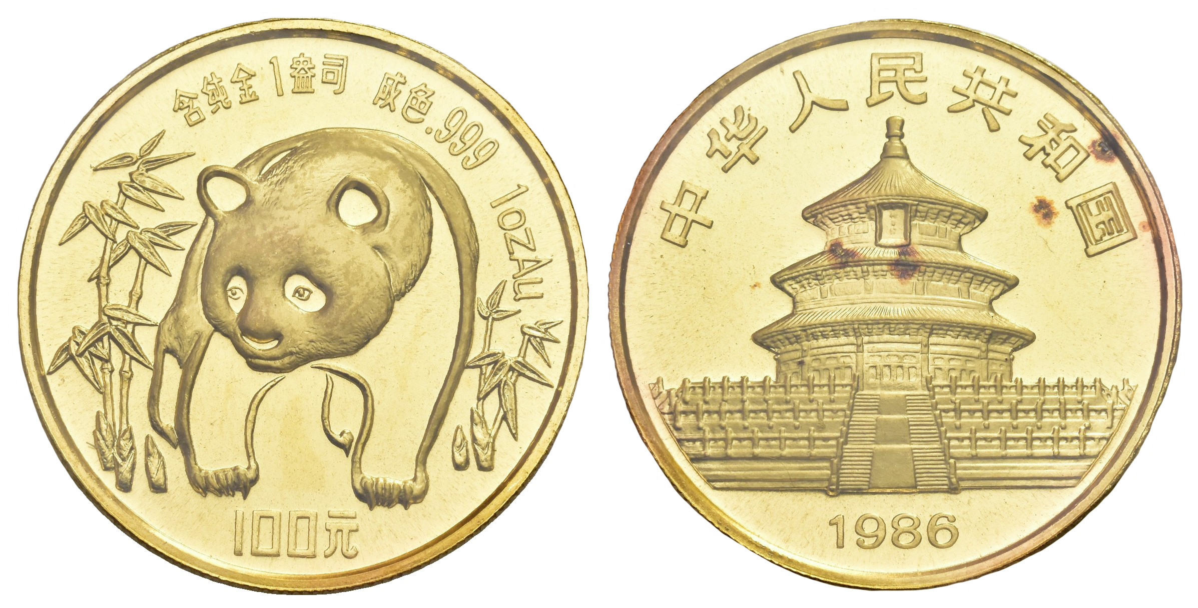 MONEDA EXTRANJERA. CHINA. 100 yuan. Panda. 1986. AU 31,13 g. 32,6 mm. KM-272. Prueba. En su plástico termosellado.