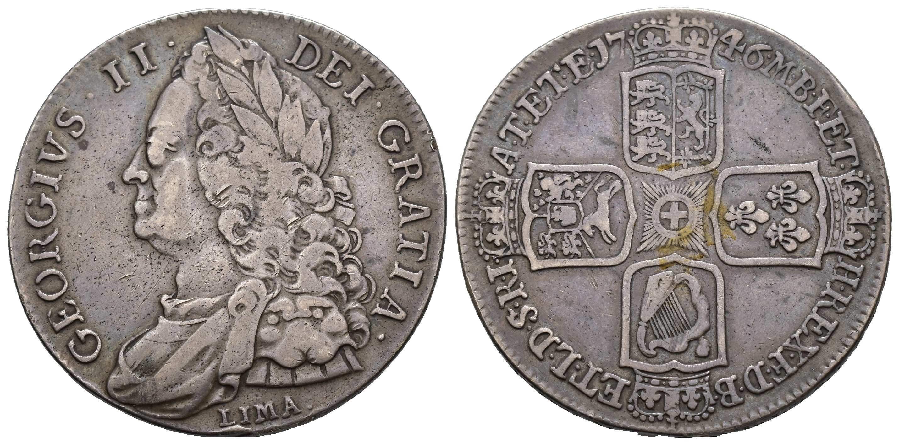 MONEDA EXTRANJERA. GRAN BRETAÑA. Jorge II. Corona. 1746. Londres. LIMA. AR 29,67 g. 39,7 mm. Spink-3689. Porosidades. MBC-/MBC.
