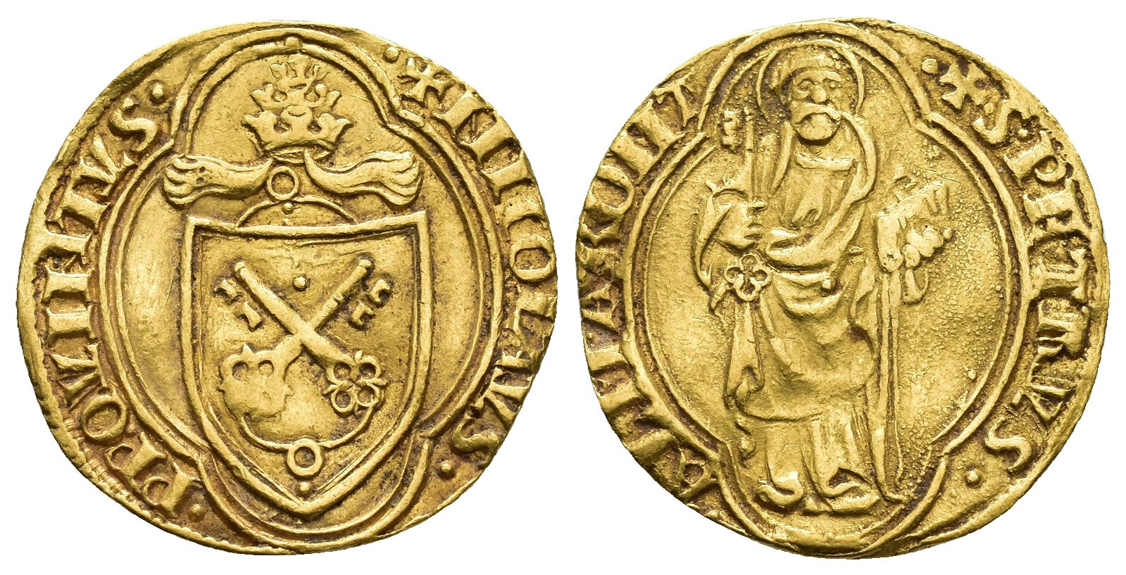 MONEDA EXTRANJERA. ITALIA Y ESTADOS ITALIANOS. ESTADOS PAPALES Y VATICANO. Nicolás V. Ducado (1447-1455). AU 3,48 g. 21,5 mm. MIR-329.1. Ligeramente alabeada. MBC.
