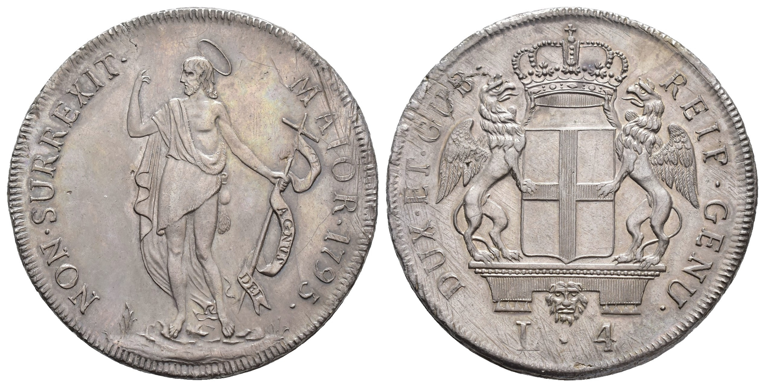 MONEDA EXTRANJERA. ITALIA Y ESTADOS ITALIANOS. GÉNOVA. 4 liras. 1795. AR 16,65 g. 34,6 mm. KM-284. Rayas de acuñación. EBC-.