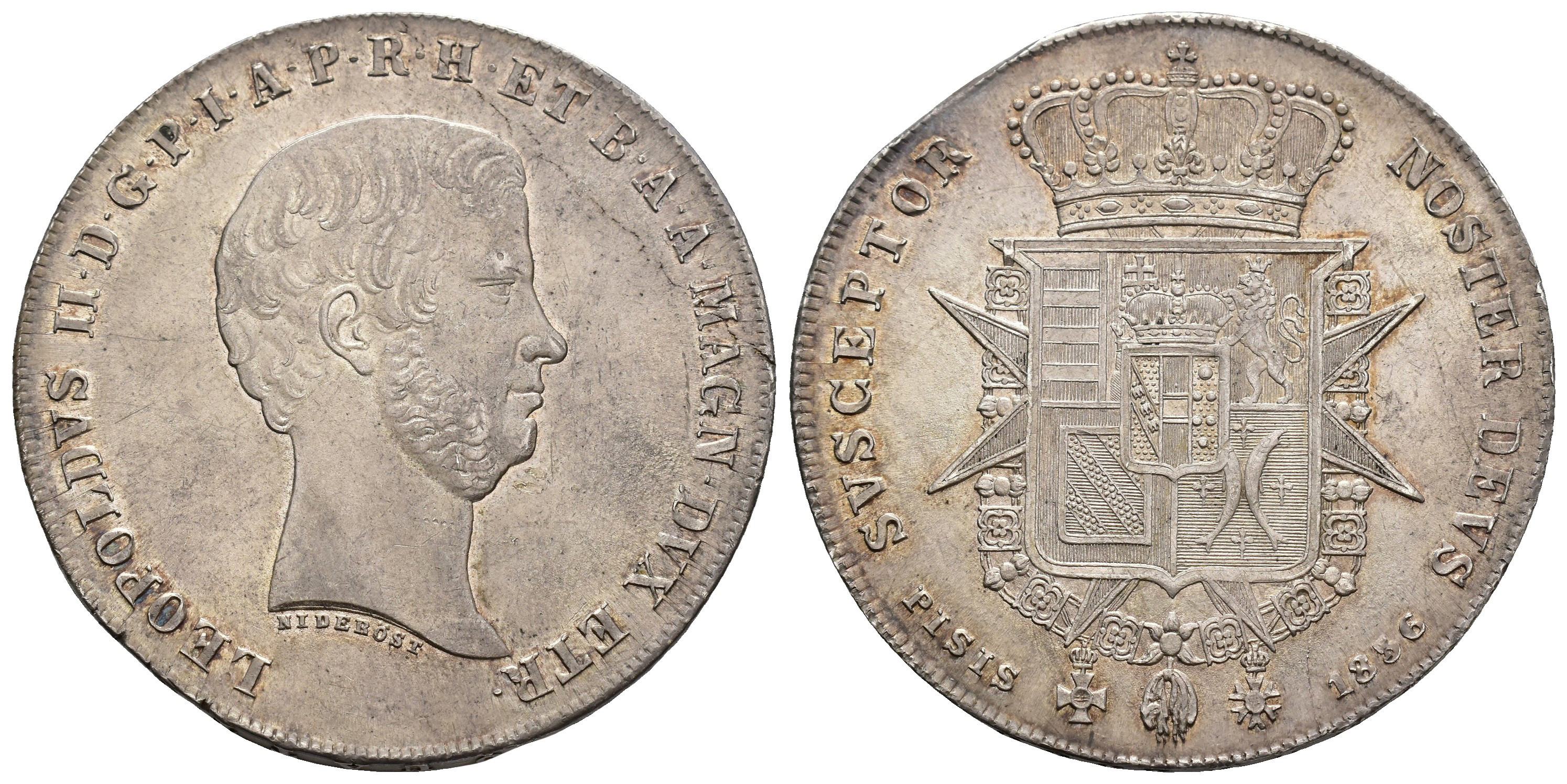 MONEDA EXTRANJERA. ITALIA Y ESTADOS ITALIANOS. TOSCANA. Leopoldo II. Pisa. 4 florines. 1856. AR 27,02 g. 40,9 mm. KM-75b. Pequeñas marcas. B.O. EBC+.