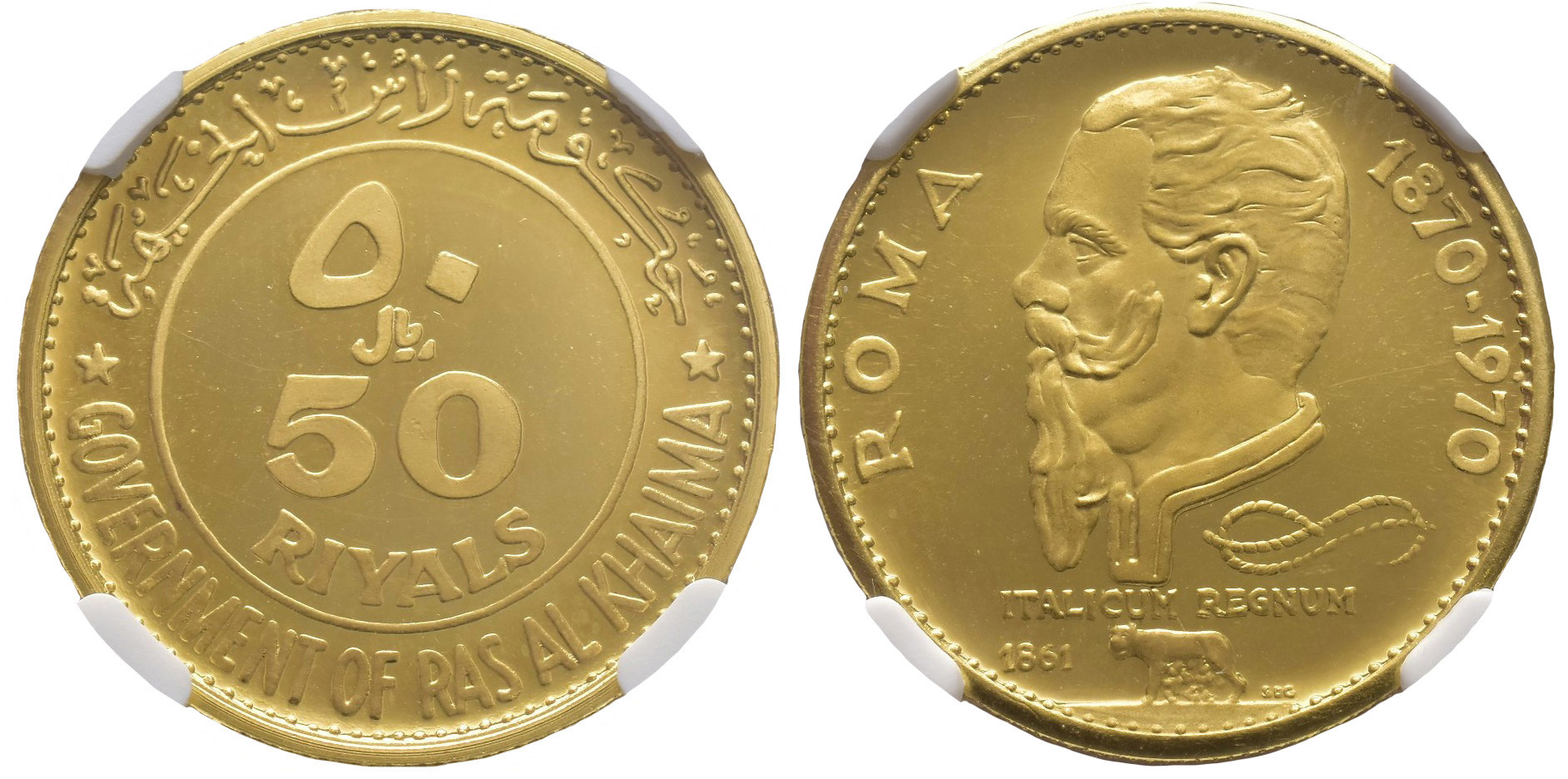 MONEDA EXTRANJERA. RAS AL KHAIMA. 50 riyals. 1970. AU. KM-21. Ultra cameo. Encapsulada por NGC-PF 67.