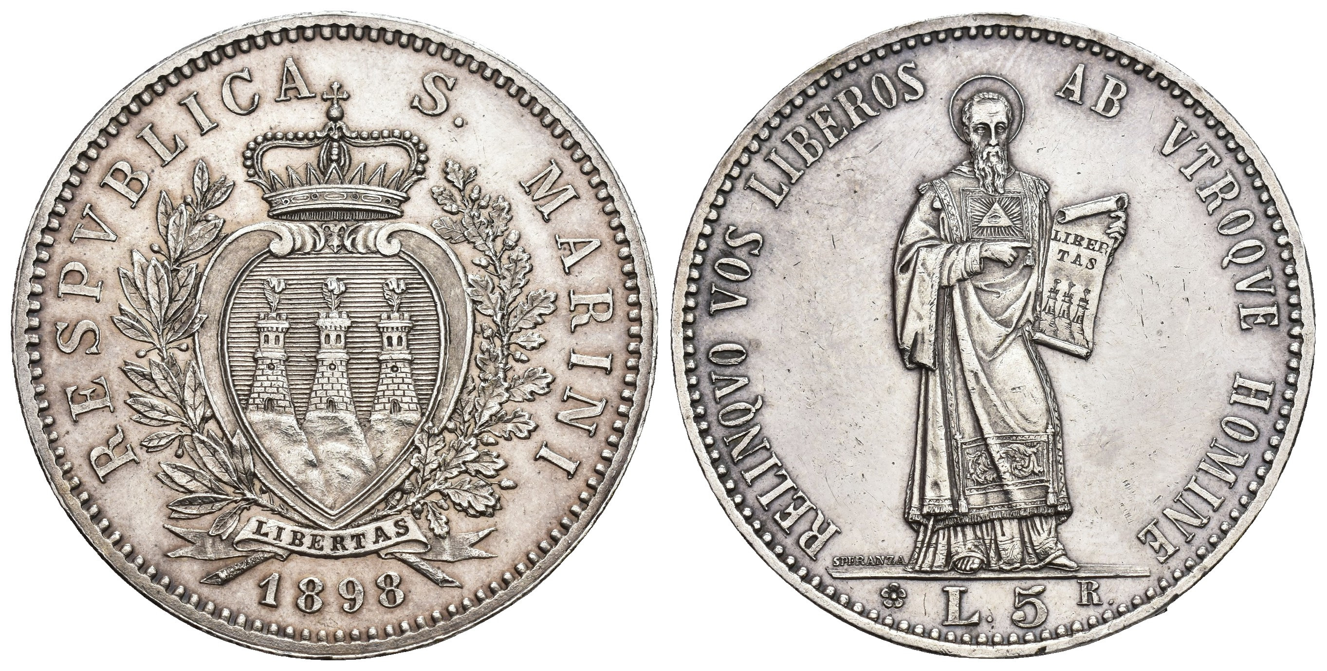 MONEDA EXTRANJERA. SAN MARINO. 5 liras. 1898. AR 25,05 g. 37 mm. KM-6. EBC.