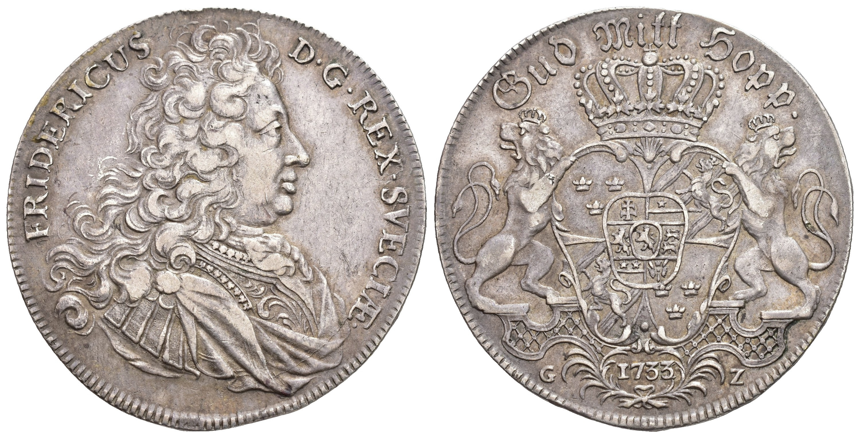MONEDA EXTRANJERA. SUECIA. Federico I. Riksdaler. 1733/2. AR 28,91 g. 41 mm. KM-395.2. Dos golpecitos en canto. MBC+.
