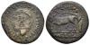 HISPANIA ANTIGUA. EMERITA. As. A/ Cabeza masculina frontal barbada vertiendo agua de un ánfora bajo ella; PERMISSV CAESAR(IS AVGV)STI. R/ Yunta fundacional a izq.; encima (AV)GVSTA, debajo (E)MERITA. AE 9,38 g. 25 mm. I-1009; APRH-11b; ACIP-3373a; CC-3869, mismo ejemplar. Erosiones. MBC.