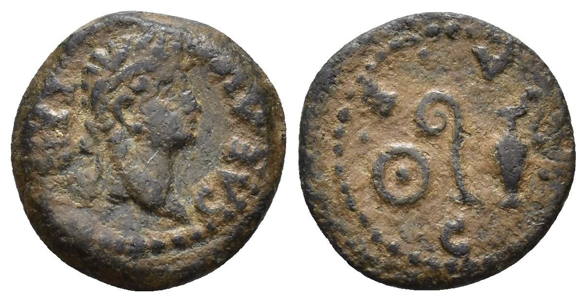 HISPANIA ANTIGUA. EMERITA. Augusto. Cuadrante. A/ Cabeza laureada a der.; (PER) CAE AVG. R/ Instrumentos sacerdotales; C-A-E. AE 2,05 g. 15,2 mm. I-1024; APRH-19; ACIP-3392; CC-3892, mismo ejemplar. Pátina oscura. BC+. Escasa.