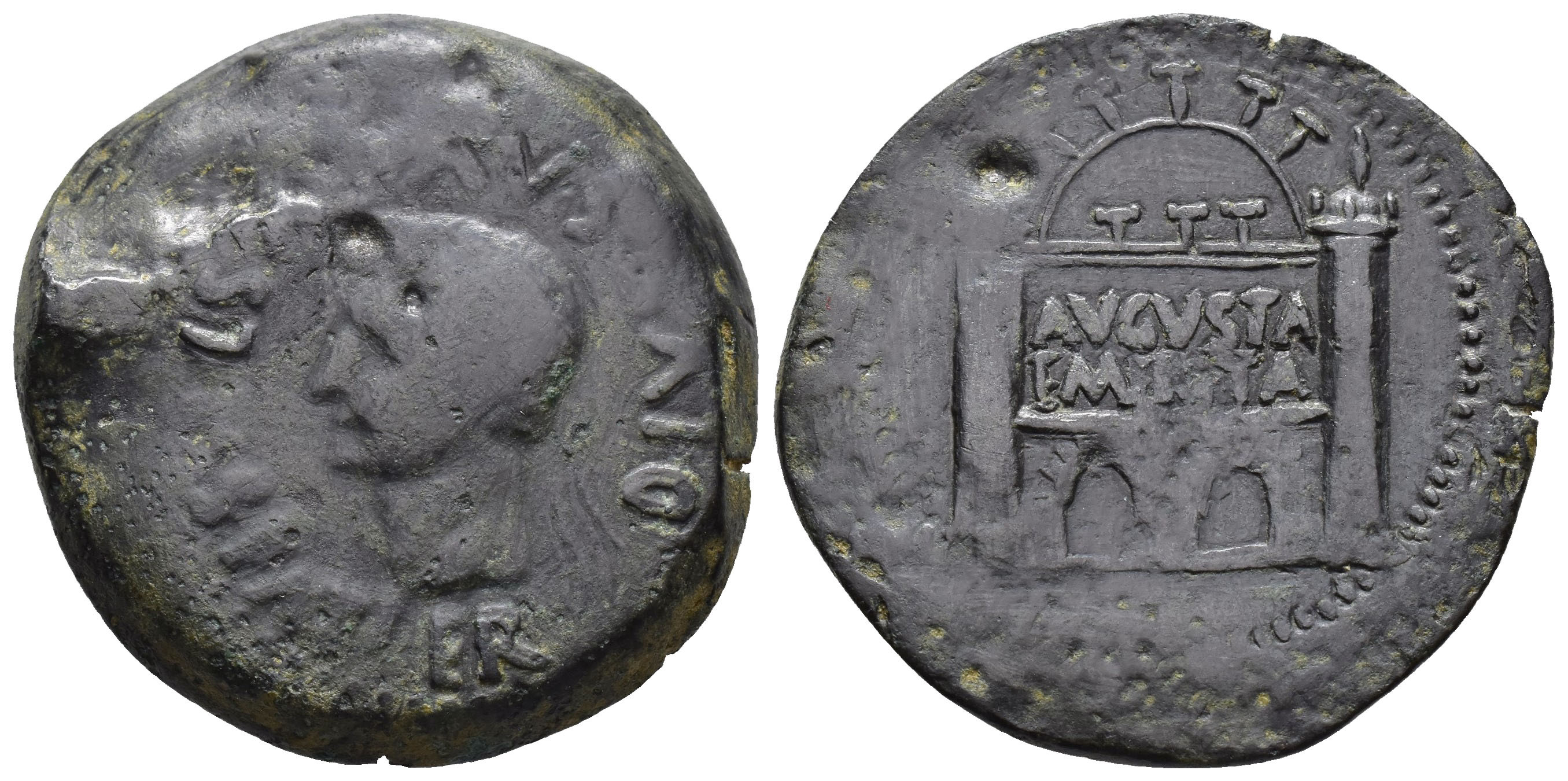 HISPANIA ANTIGUA. EMERITA. Tiberio. Dupondio. A/ Cabeza de Augusto radiada a izq.; DIVVS AV(GV)STVS PAT-ER. R/ Recinto amurallado de la ciudad; AVGVSTA/EMERITA. AE 29,07 g. 37 mm. I-1031; APRH-23b; ACIP-3388; CC-3906, mismo ejemplar. Acuñación defectuosa. Pequeñas erosiones. Pátina oscura. BC-/MBC-.