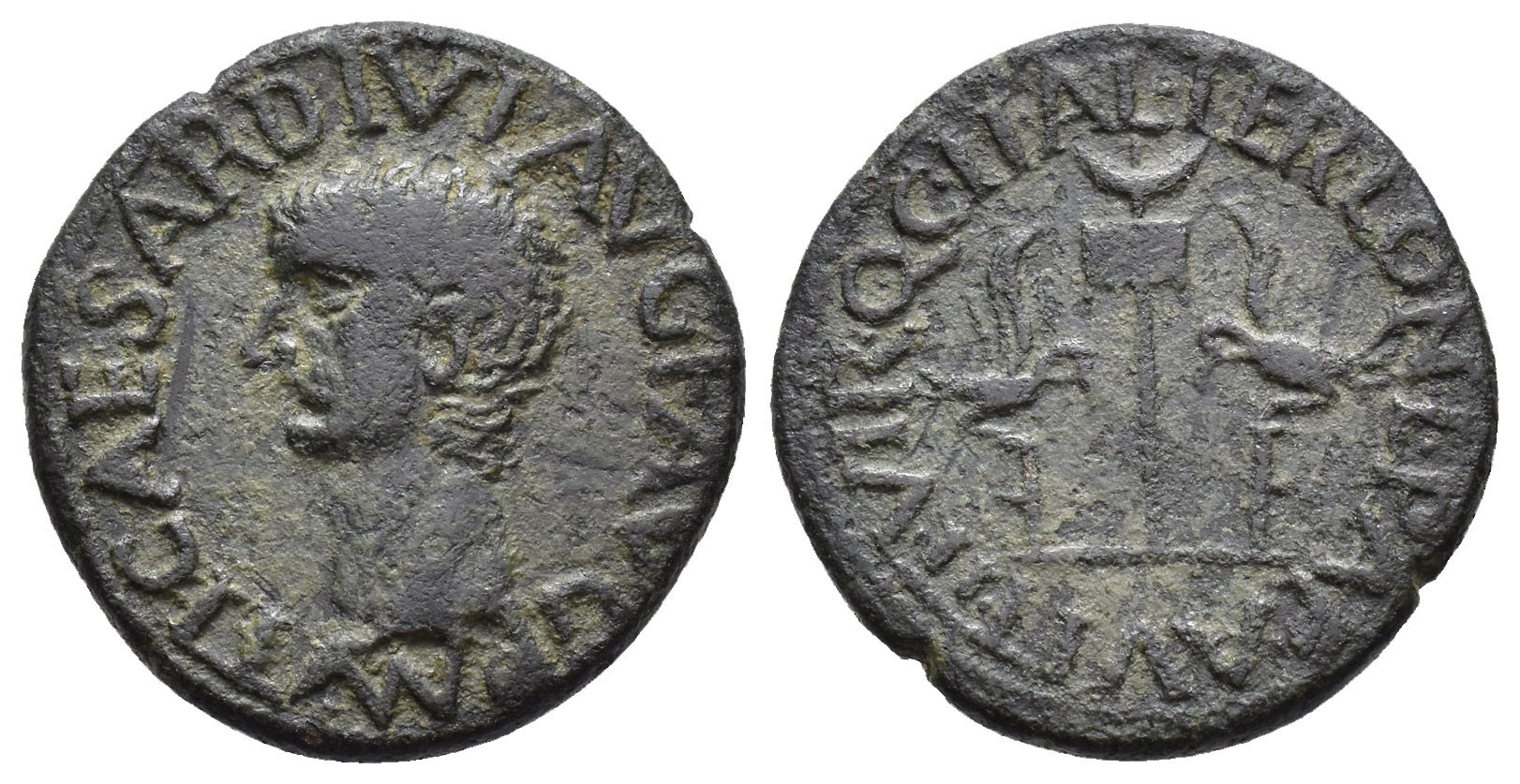 HISPANIA ANTIGUA. ILICI. Tiberio. Semis. A/ Cabeza a izq.; TI CAESAR DIVI AVG F AVG P M. R/ Dos aquilae, en medio vexillum; C II ALTER LON L PAP AVIT II VIR Q. AE 5,77 g. 22 mm. I-1529; APRH-199; ACIP-3210; CC-4445, mismo ejemplar. Pátina verde oscuro. MBC-/MBC.