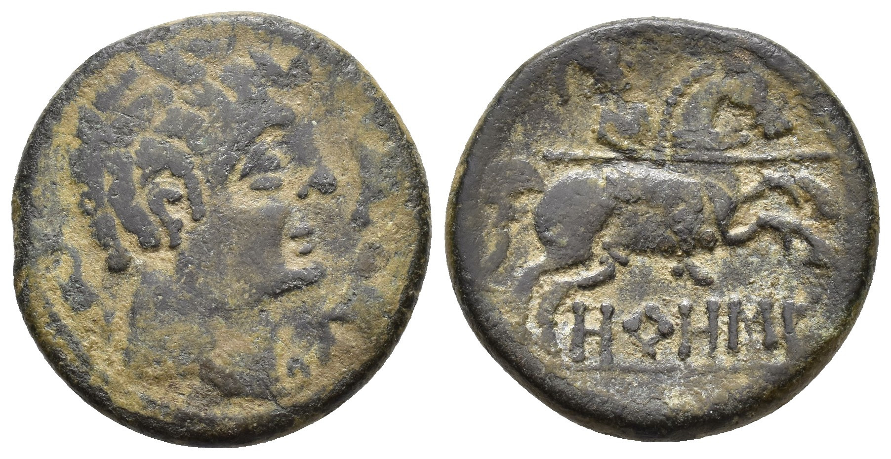 HISPANIA ANTIGUA. OROSIS. Unidad. A/ Cabeza masculina a der., alrededor 3 delfines. R/ Jinete con lanza a der., debajo sobre línea OROSI. AE 9,34 g. 24,3 mm. I-1908; ACIP-1510. BC+/MBC-.