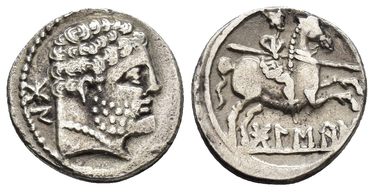 HISPANIA ANTIGUA. BOLSKAN. Denario. A/ Cabeza masculina a der., detrás BoN. R/ Jinete con lanza a der., debajo sobre línea BoLSKaN. AR 3,47 g. 17,3 mm. I-1911; ACIP-1413. MBC/MBC-.