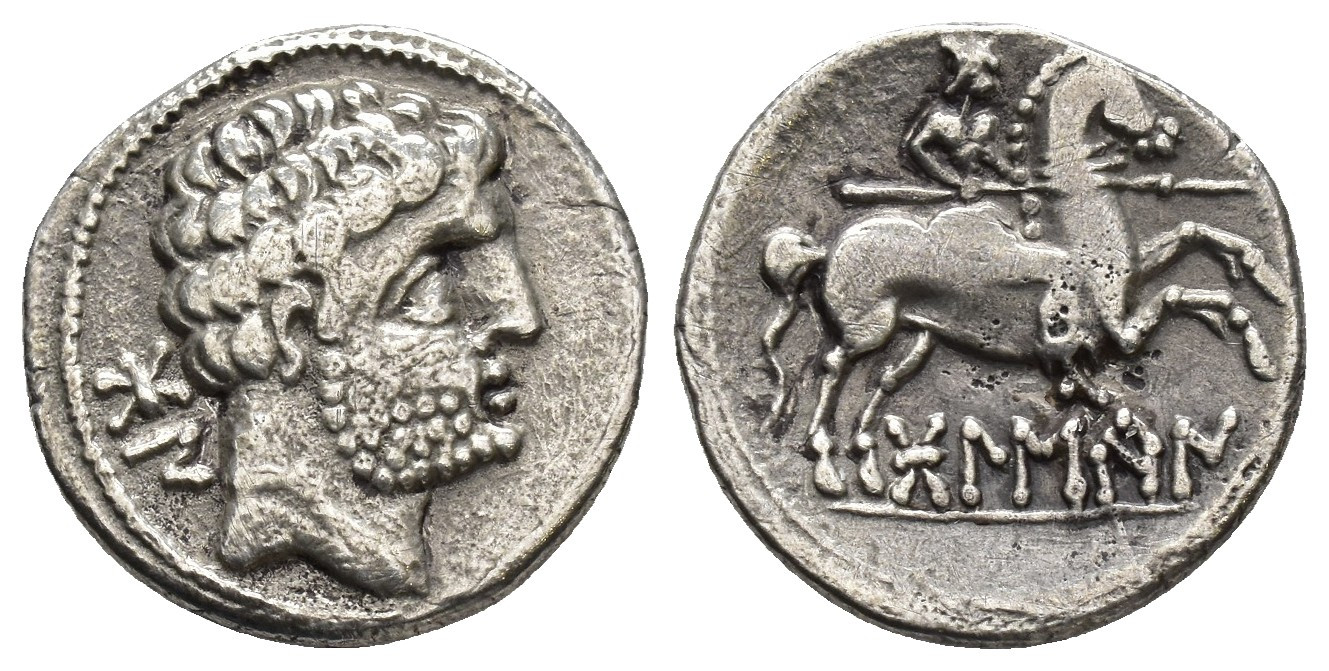 HISPANIA ANTIGUA. BOLSKAN. Denario. A/ Cabeza masculina a der., detrás BoN. R/ Jinete con lanza a der., debajo sobre línea BoLSKaN. AR 3,45 g. 17,5 mm. I-1911; ACIP-1413. Leves erosiones. MBC.