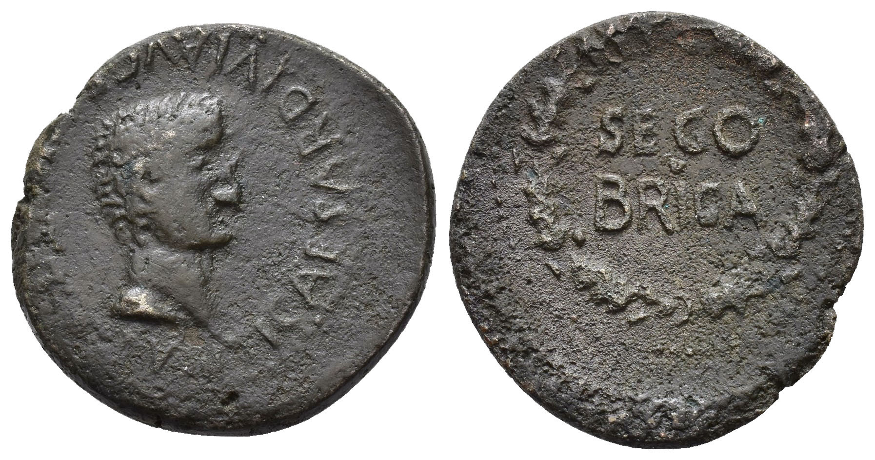 HISPANIA ANTIGUA. SEGOBRIGA. Tiberio Semis. A/ Cabeza a der.; TI CAESAR DIVI AVG (F AVGVST IMP VIII). R/ Corona cívica rodeando SEGO/BRIGA. AE 7,09 g. 25 mm. I-2190; APRH-475; ACIP-3245; CC-5146, mismo ejemplar. Superficies erosionadas. Anv. descentrado. Pátina verde oscuro. MBC-/MBC.