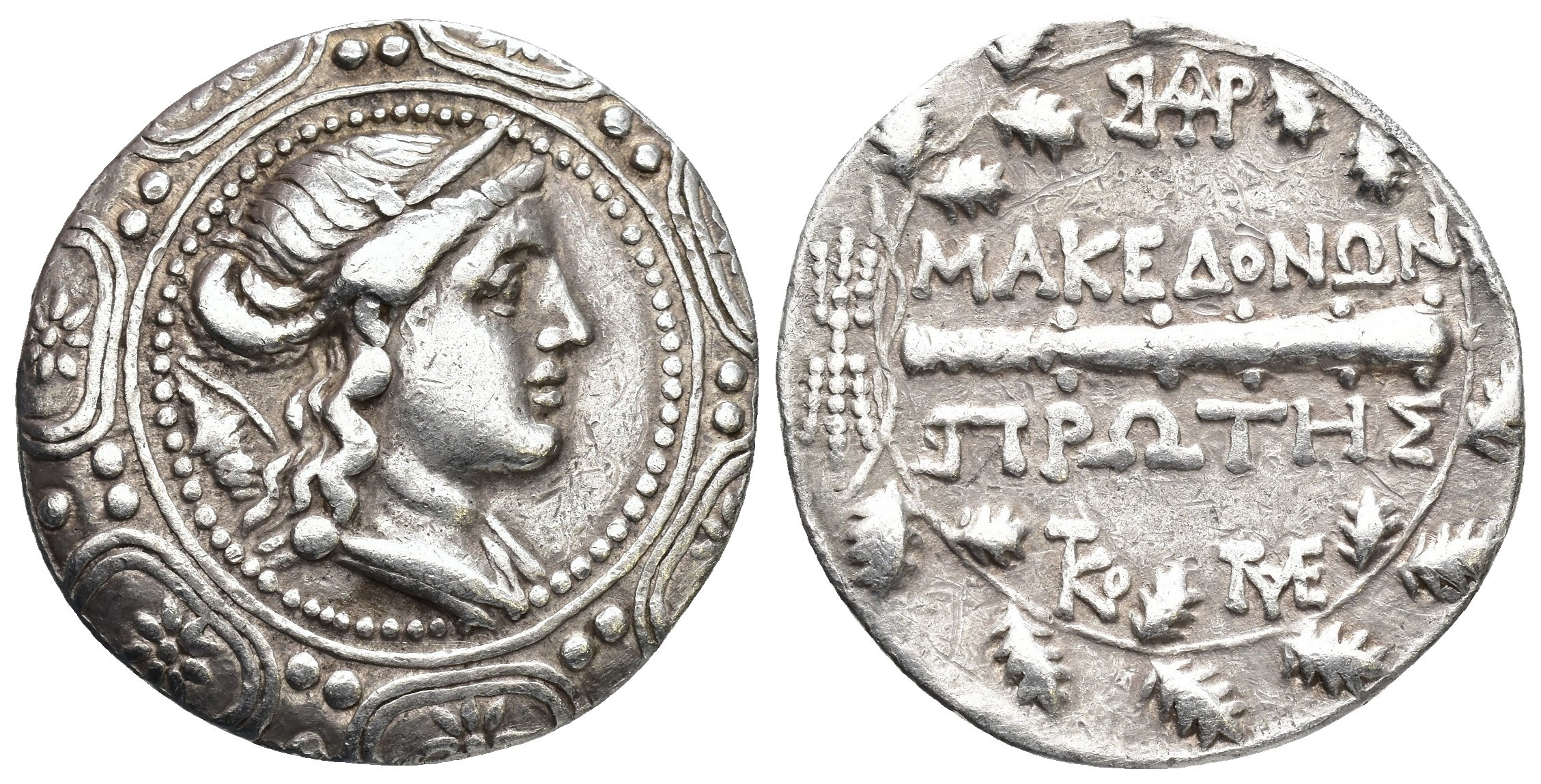 GRECIA ANTIGUA. MACEDONIA. Dominio romano. Tetradracma (158-150 a.C.). A/ Cabeza de Ártemis a der. dentro de escudo macedonio. R/ Corona de roble con haz de rayos rodeando clava, encima monograma y debajo dos monogramas; MAKEDONWN/PROTHS. AR 16,7 g. 31 mm. COP-1314. MBC.