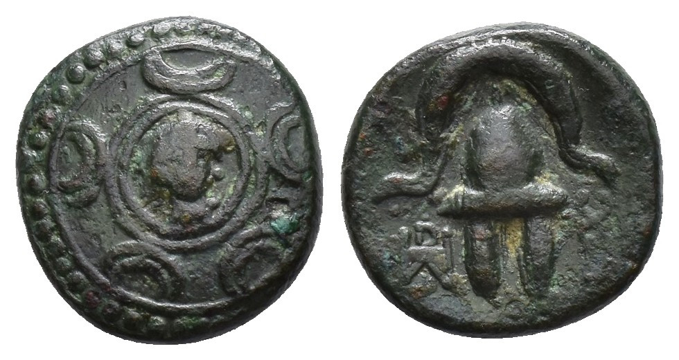 GRECIA ANTIGUA. MACEDONIA. AE (Emisión anónima post. 311 a.C.). A/ Escudo macedonio con cabeza frontal de Herakles en el centro. R/ Casco macedonio, a der. e izq. monograma. AE 2,09 g. 13,1 mm. COP-1134. MBC.