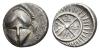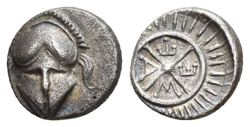 GRECIA ANTIGUA. TRACIA. Mesembria. Dióbolo. A/ Casco. R/ Rueda, entre los radios M-E-T-A retrógrada. AR 1,21 g. 10,3 mm. COP-652; SBG-1673. MBC+.