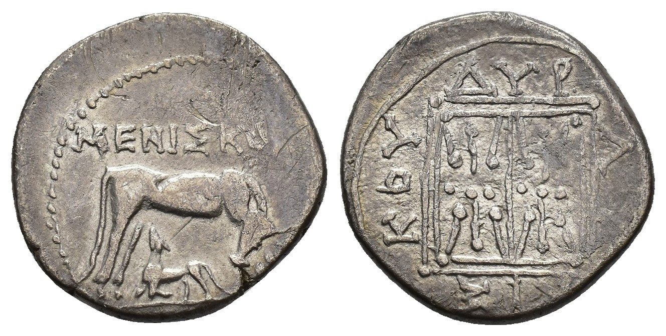 GRECIA ANTIGUA. ILIRIA. Dirraquio. Dracma (c. 200-30 a.C.). A/ Vaca a der. amamantando ternero; MENISKO(S). R/ Cuadrado con doble diseño decorativo; DURA(XK)ISKOU. AR 2,87 g. 17,5 mm. COP-478. Algo descentrada. Rayitas. MBC.