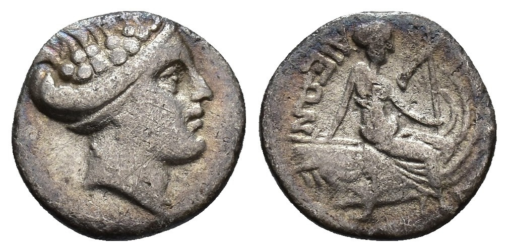GRECIA ANTIGUA. EUBEA. Histiaia. Tetróbolo (s. III-146 a.C.). A/ Cabeza de Ménade coronada de vid a der. R/ Ninfa Histiaia sentada sobre proa de nave a der.; (ISTI)AIEWN. AR 1,01 g. 12,6 mm. COP-517 ss. MBC-.