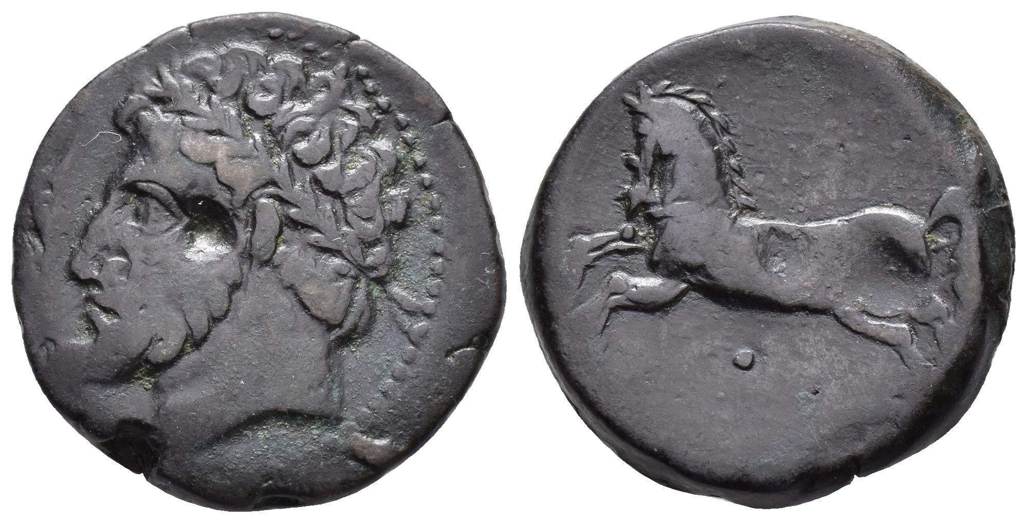 GRECIA ANTIGUA. NUMIDIA. Massinisa o Micipsa. Unidad. A/ Cabeza laureada a izq. R/ Caballo galopando a izq., debajo glóbulo. AE 15,13 g. 26,9 mm. COP-505; MAA-18a. Punzón y defectos de cospel. Pátina verde. MBC-.
