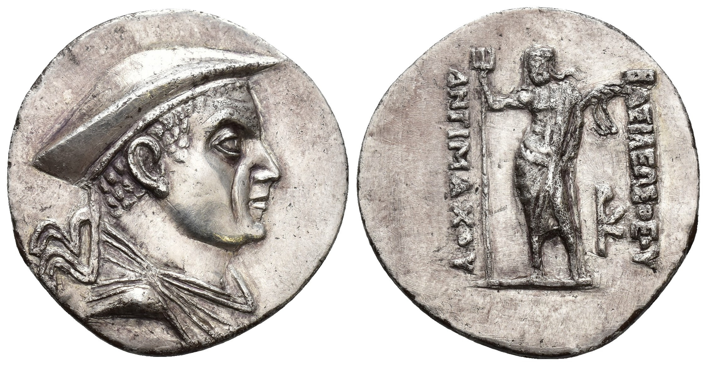 GRECIA ANTIGUA. BACTRIA. Antímaco I. Tetradracma (171-160 a.C.). A/ Cabeza con causia a der., drapeada y diademada. R/ Poseidón a izq. con tridente y palma, a der. monograma; BASILEWS QEOU/ANTIMAXOU. AR 14,44 g. 30,8 mm. COP-no; SBG-7542. Campos repasados, incluso los relieves del rev. MBC+/RC.