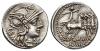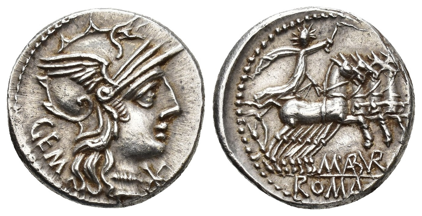 REPÚBLICA ROMANA. ABURIA. C. Aburius Geminus. Denario. Roma (132 a.C.). A/ Cabeza de Roma a der., detrás GEM, marca de valor bajo la barbilla. R/ Sol con látigo conduciendo cuadriga a der., debajo M ABVR(I), en exergo ROMA. AR 3,99 g. 18,5 mm. CRAW-250.1 var.; FFC-88 var. EBC-.