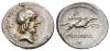 REPÚBLICA ROMANA. CALPURNIA. L. Calpurnius Piso Frugi. Denario. Roma (90-89 a.C.). A/ Cabeza de Apolo a der., detrás O y E debajo del mentón. R/ Jinete cabalgando a der.; O encima del jinete, debajo L. PISO FRVGI/ N. AR 3,79 g. 19,2 mm. CRAW-340.1; FFC-276. Acuñación algo defectuosa en el anv. R.B.O. EBC-.