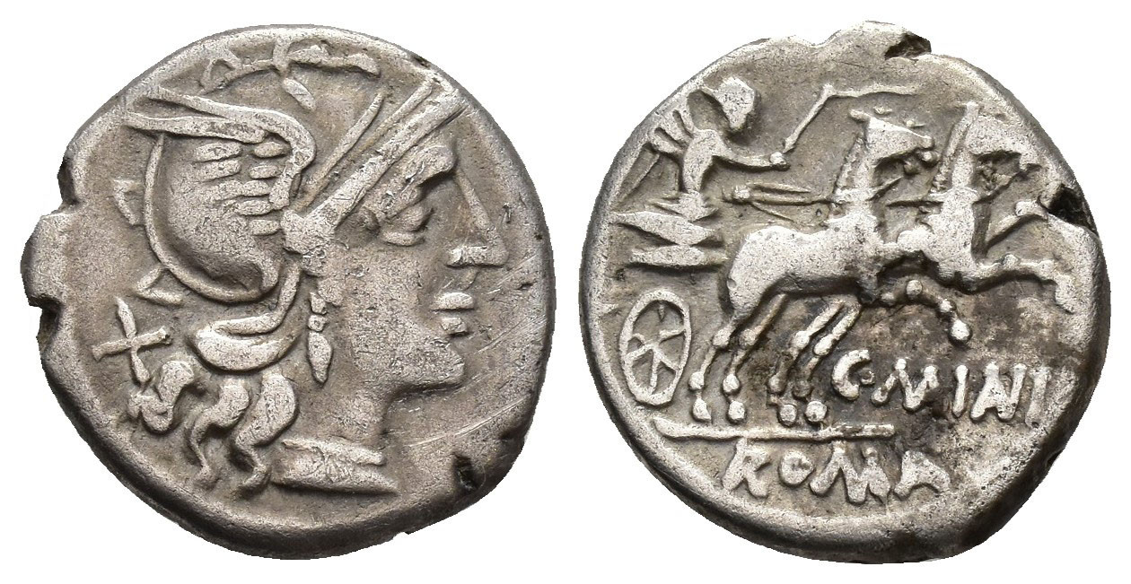 REPÚBLICA ROMANA. MAIANIA. C. Maianius. Denario. Roma (153 a.C.). A/ Cabeza de Roma a der. R/ Victoria en biga a der.; debajo C/ MAIANI/ROMA. AR 3,7 g. 16,7 mm. CRAW-203.1; FFC-832. Pequeñas marcas. BC+.