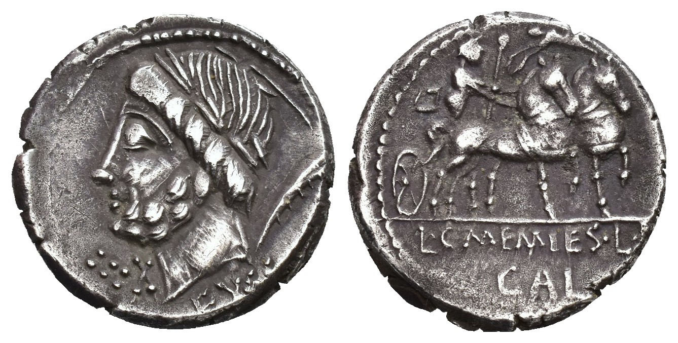 REPÚBLICA ROMANA. MEMMIA. L. y C. Memmius Gal. Roma. Denario. A/ Cabeza de Saturno a izq., detrás guadaña, delante XIII y EX S C. R/ Venus en biga a der.; L C MEMIES L (F) GAL. AR 3,51 g. 17,6 mm. CRAW-349.1 var.; FFC-911. MBC.