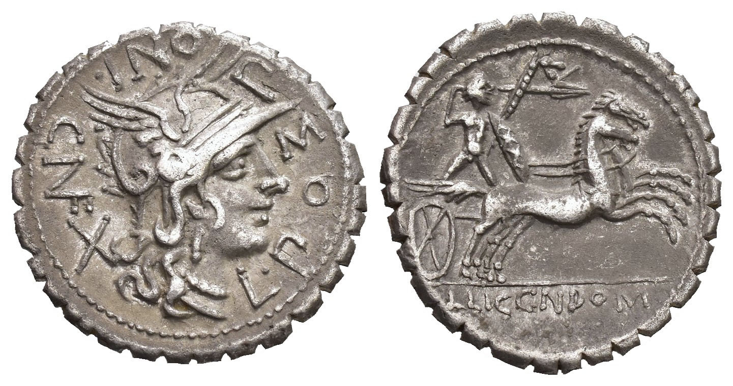 REPÚBLICA ROMANA. POMPONIA. L. Pomponius Cn. F. Denario. Narbo (118 a.C.). A/ Cabeza de Roma a der., detrás L POMPONI CN F. R/ Bituitio en biga a der., en exergo L LIC CN DOM. AR 3,93 g. 20 mm. CRAW-282.4; FFC-1027. MBC.