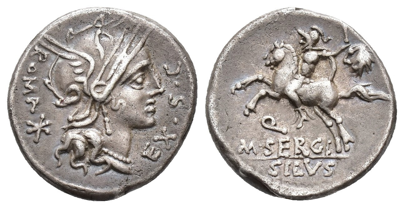 REPÚBLICA ROMANA. SERGIA. M. Sergius Silus. Denario. Roma (116-115 a.C). A/ Cabeza de Roma a der., detrás ROMA, delante EX S C. R/ Jinete blandiendo espada a izq., detrás cabeza de bárbaro, debajo Q/ M SERGI/SILVS. AR 3,9 g. 17,6 mm. CRAW-286.1; FFC-1111. MBC+/MBC.