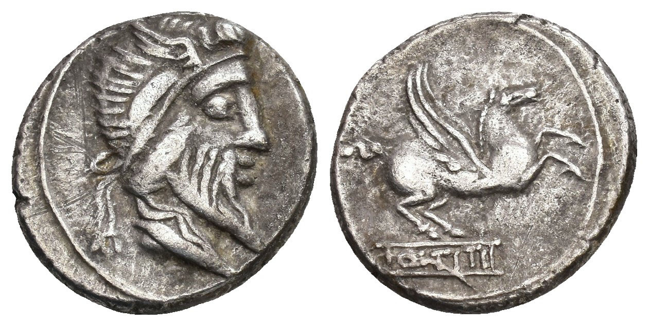 REPÚBLICA ROMANA. TITIA. Q. Titius. Denario. Italia central (90 a.C.). A/ Cabeza de Mutius Titus a der. R/ Pegaso a der.; Q TITI en cartela. AR 3,69 g. 17,2 mm. CRAW-341.1; FFC-1142. MBC.