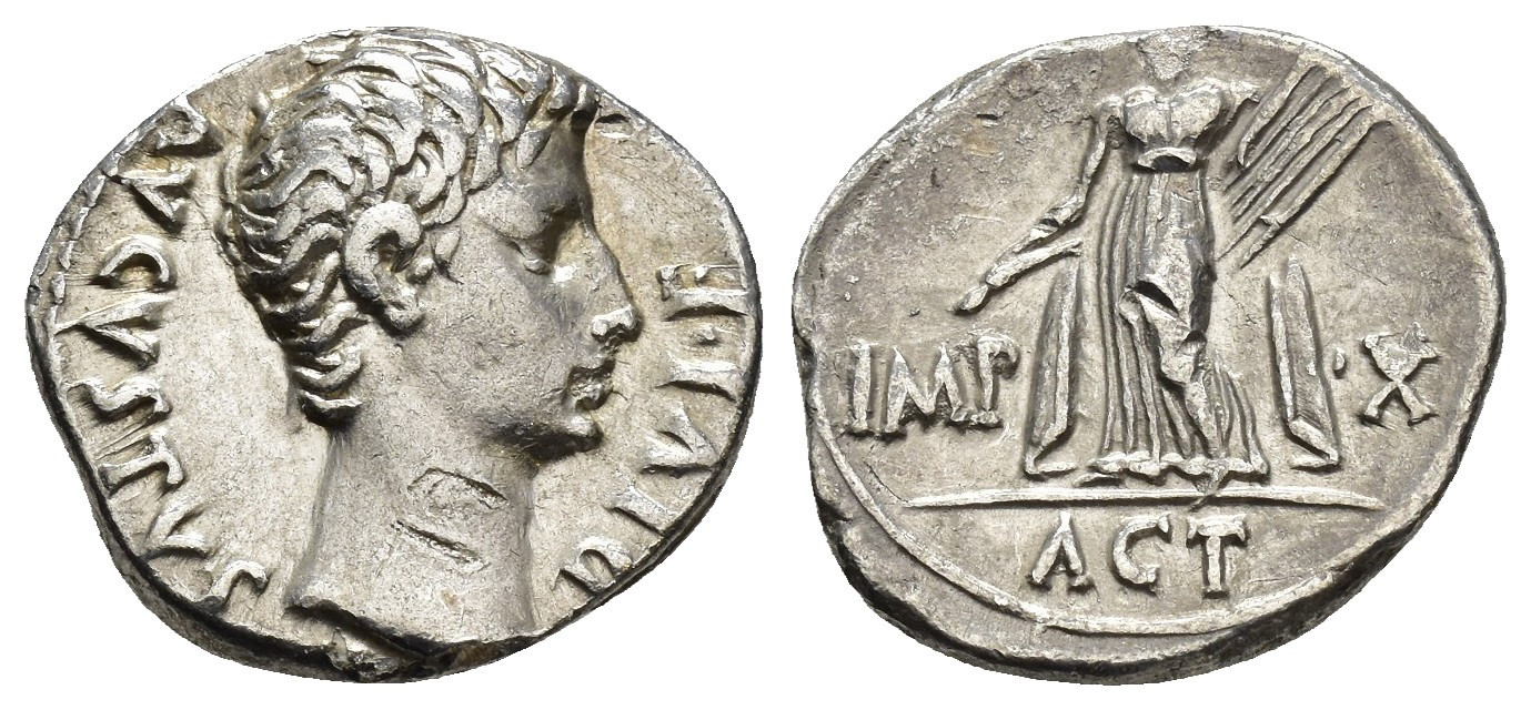 PERIODO DE JULIO CÉSAR A AUGUSTO. AUGUSTO. Denario. Lugdunum (15-13 a.C.). A/ Cabeza a der.; AVGVSTVS DIVI F. R/ Apolo a izq.; IMP X/ ACT. AR 3,68 g. 18,7 mm. RIC-171; FFC-111. Contramarca en anv. y rayitas en rev. MBC+.