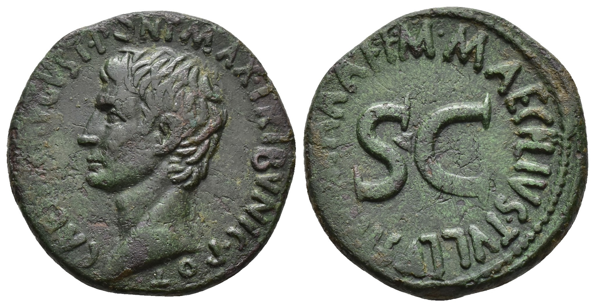 PERIODO DE JULIO CÉSAR A AUGUSTO. AUGUSTO. As. Roma (7 a.C.). A/ Cabeza a izq.; CAE(SAR AV)GVST PONT MAX TRIBVNIC POT. R/ S C, alrededor M MAECILIS TVLLV(S) II VIR (R A A F F). AE 11,08 g. 27,3 mm. RIC-436. Vanos en anv. y rev. Pátina verde ligeramente erosionada. MBC/MBC+.
