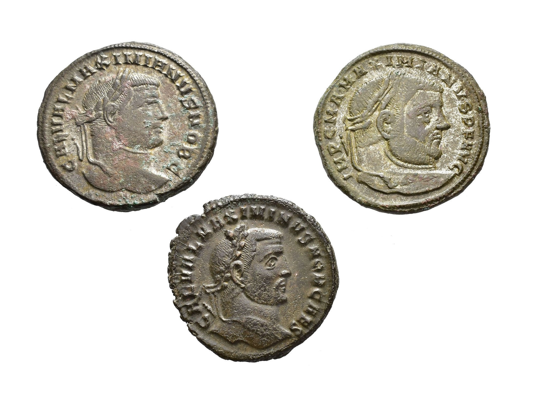 IMPERIO ROMANO. Lote de 3 follis: Galerio Maximiano, Maximiano y Maximino II. MBC-/MBC+.