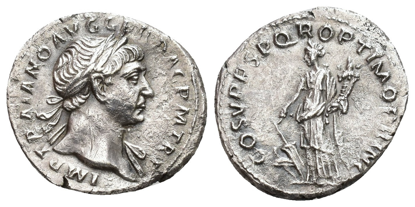 IMPERIO ROMANO. TRAJANO. Denario. Roma (103-111). A/ Cabeza laureada y drapeada al hombro a der.; IMP TRAIANO AVG GER DAC P M TR P. R/ Fortuna a izq. con timón y cornucopia; COS V P P S P Q R OPTIMO PRINC. AR 2,88 g. 18,7 mm. RIC-122. Erosiones. EBC-.