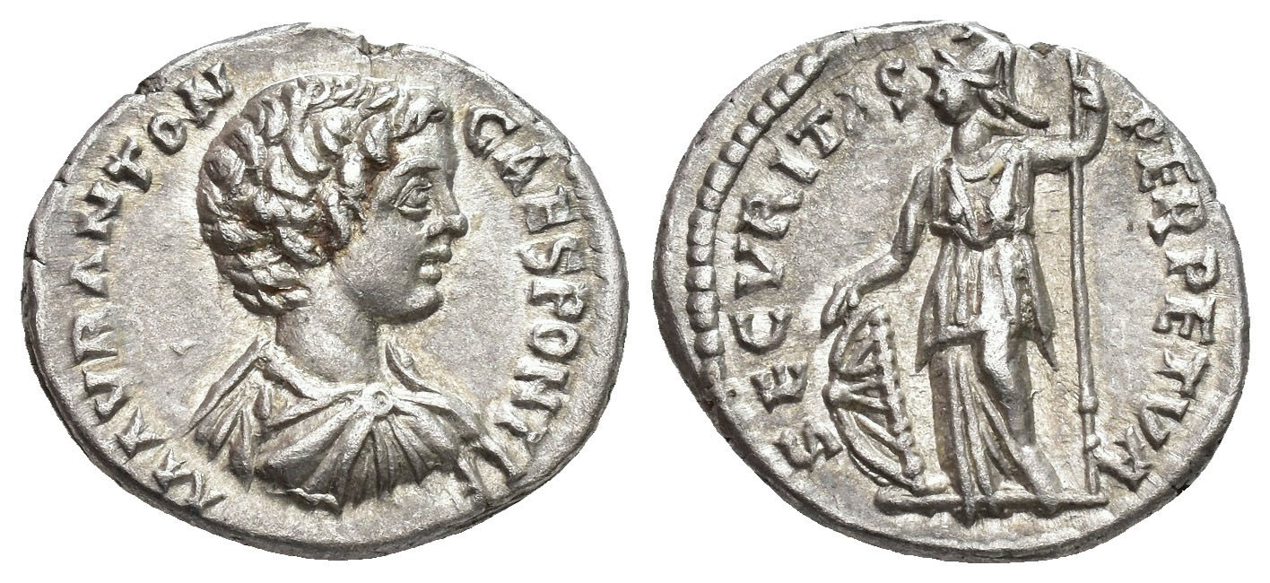 IMPERIO ROMANO. CARACALLA. Denario. Laodicea (196-197). A/ Busto drapeado y acorazado a der.; M AVR ANTON CAES PONTIF. R/ Minerva a izq. con escudo y lanza; SECVRITAS PERPETVA. AR 3,81 g. 19,1 mm. RIC-330. EBC-/MBC+.