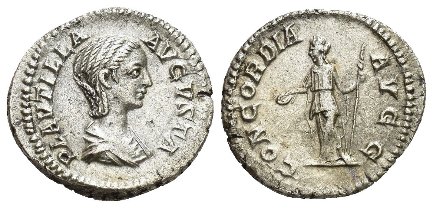 IMPERIO ROMANO. PLAUTILLA. Denario. Roma (202-203). A/ Busto drapeado a der.; PLAVTILLA AVGVSTA. R/ Concordia con pátera y cetro; CONCORDIA AVGG. AR 3,14 g. 17,8 mm. RIC-363a. Cospel abierto. MBC+/MBC.